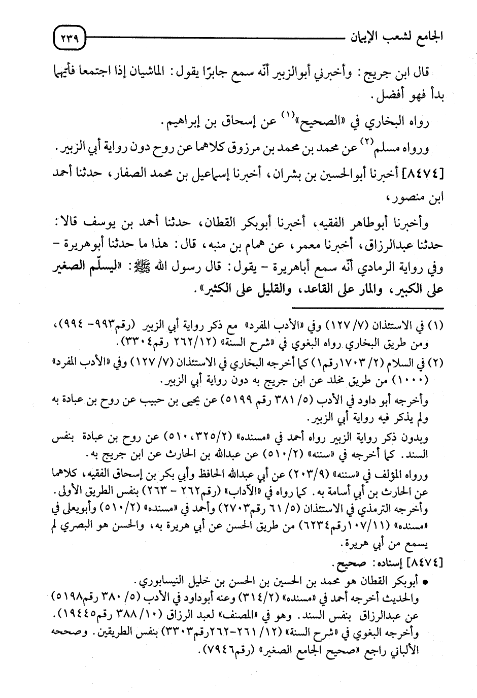 قَالَ ابْنُ جُرَيْجٍ: وَأَخْبَرَنِي أَبُو الزُّبَيْرِ، أَنَّهُ سَمِعَ جَابِرًا، يَقُولُ: " §الْمَاشِيَانِ إِذَا اجْتَمَعَا فَأَيُّهُمَا بَدَأَ بِالسَّلَامِ، فَهُوَ أَفْضَلُ ". رَوَاهُ الْبُخَارِيُّ فِي الصَّحِيحِ، عَنْ إِسْحَاقَ بْنِ إِبْرَاهِيمَ. وَرَوَاهُ مُسْلِمٌ، عَنْ مُحَمَّدِ بْنِ مَرْزُوقٍ، كِلَاهُمَا عَنْ رَوْحٍ دُونَ رِوَايَةِ أَبِي الزُّبَيْرِ