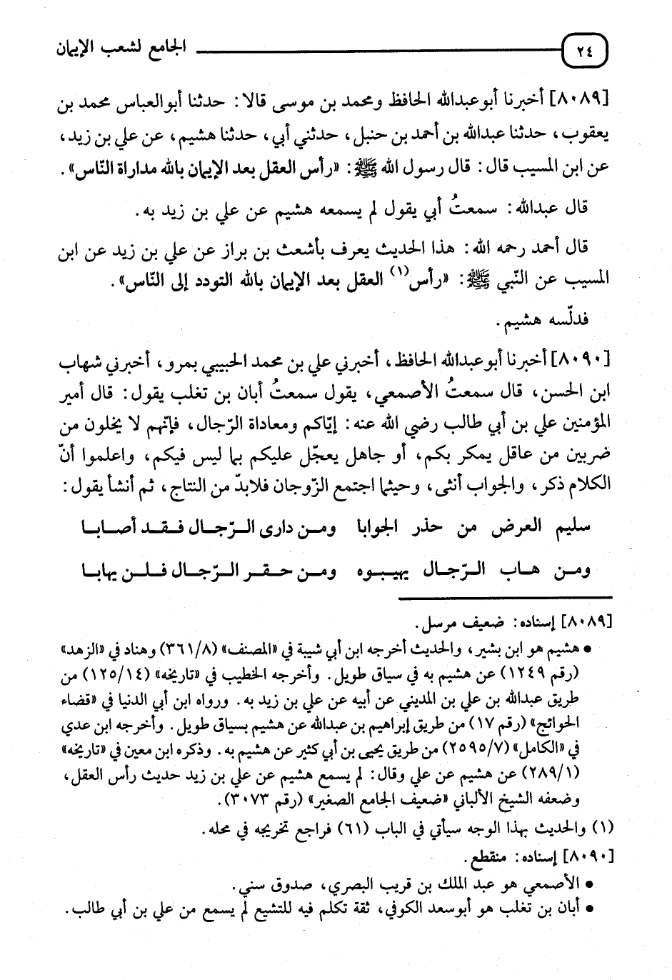 8089 - أَخْبَرَنَا أَبُو عَبْدِ اللهِ الْحَافِظُ، وَمُحَمَّدُ بْنُ مُوسَى، قَالَا: نا أَبُو الْعَبَّاسِ مُحَمَّدُ بْنُ يَعْقُوبَ، نا عَبْدُ اللهِ بْنُ أَحْمَدَ بْنِ حَنْبَلٍ، حَدَّثَنِي أَبِي، نا هُشَيْمٌ، عَنْ عَلِيِّ بْنِ زَيْدٍ، عَنِ ابْنِ الْمُسَيِّبِ، قَالَ: قَالَ رَسُولُ اللهِ صَلَّى اللَّهُ عَلَيْهِ وَسَلَّمَ: §" رَأْسُ الْعَقْلِ بَعْدَ الْإِيمَانِ بِاللهِ مُدَارَاةُ النَّاسِ "