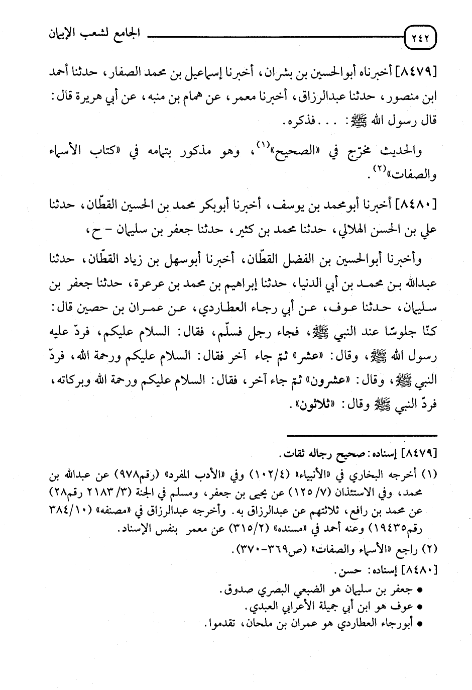 8480 - أَخْبَرَنَا أَبُو مُحَمَّدِ بْنُ يُوسُفَ، قَالَ: أنا أَبُو بَكْرٍ مُحَمَّدُ بْنُ الْحُسَيْنِ الْقَطَّانُ، قَالَ: نا عَلِيُّ بْنُ الْحَسَنِ الْهِلَالِيُّ، قَالَ: نا مُحَمَّدُ بْنُ كَثِيرٍ، قَالَ: نا جَعْفَرُ بْنُ سُلَيْمَانَ، ح وَأَخْبَرَنَا أَبُو الْحُسَيْنِ بْنُ الْفَضْلِ الْقَطَّانُ، قَالَ: أنا أَبُو سَهْلِ بْنُ زِيَادٍ الْقَطَّانُ، قَالَ: نا عَبْدُ اللهِ بْنُ مُحَمَّدِ بْنِ أَبِي الدُّنْيَا، قَالَ: نا إِبْرَاهِيمُ بْنُ مُحَمَّدِ بْنِ عَرْعَرَةَ، قَالَ: نا جَعْفَرُ بْنُ سُلَيْمَانَ، قَالَ: نا عَوْفٌ، عَنْ أَبِي رَجَاءٍ الْعُطَارِدِيِّ، عَنْ عِمْرَانَ بْنِ حُصَيْنٍ، قَالَ: كُنَّا جُلُوسًا عِنْدَ النَّبِيِّ صَلَّى اللَّهُ عَلَيْهِ وَسَلَّمَ §فَجَاءَ رَجُلٌ، فَقَالَ: السَّلَامُ عَلَيْكُمْ، فَرَدَّ عَلَيْهِ رَسُولُ اللهِ صَلَّى اللَّهُ عَلَيْهِ وَسَلَّمَ، وَقَالَ: " عَشْرٌ "، ثُمَّ جَاءَ آخَرُ فَقَالَ: السَّلَامُ عَلَيْكُمْ وَرَحْمَةُ اللهِ، فَرَدَّ النَّبِيُّ صَلَّى اللَّهُ عَلَيْهِ وَسَلَّمَ وَقَالَ: " عِشْرُونَ "، ثُمَّ جَاءَ آخَرُ فَقَالَ: السَّلَامُ عَلَيْكُمْ وَرَحْمَةُ اللهِ وَبَرَكَاتُهُ، فَرَدَّ النَّبِيُّ صَلَّى اللَّهُ عَلَيْهِ وَسَلَّمَ وَقَالَ: " ثَلَاثُونَ ". " -[243]- لَفْظُ حَدِيثِ أَبِي الْحُسَيْنِ الْقَطَّانِ ". وَفِي رِوَايَةِ ابْنِ يُوسُفَ: جَاءَ رَجُلٌ إِلَى النَّبِيِّ صَلَّى اللَّهُ عَلَيْهِ وَسَلَّمَ فَقَالَ، وَزَادَ فِي كُلِّ مَرَّةٍ: ثُمَّ جَلَسَ. هَذَا إِسْنَادٌ حَسَنٌ. أَخْرَجَهُ أَبُو دَاوُدَ فِي السُّنَنِ