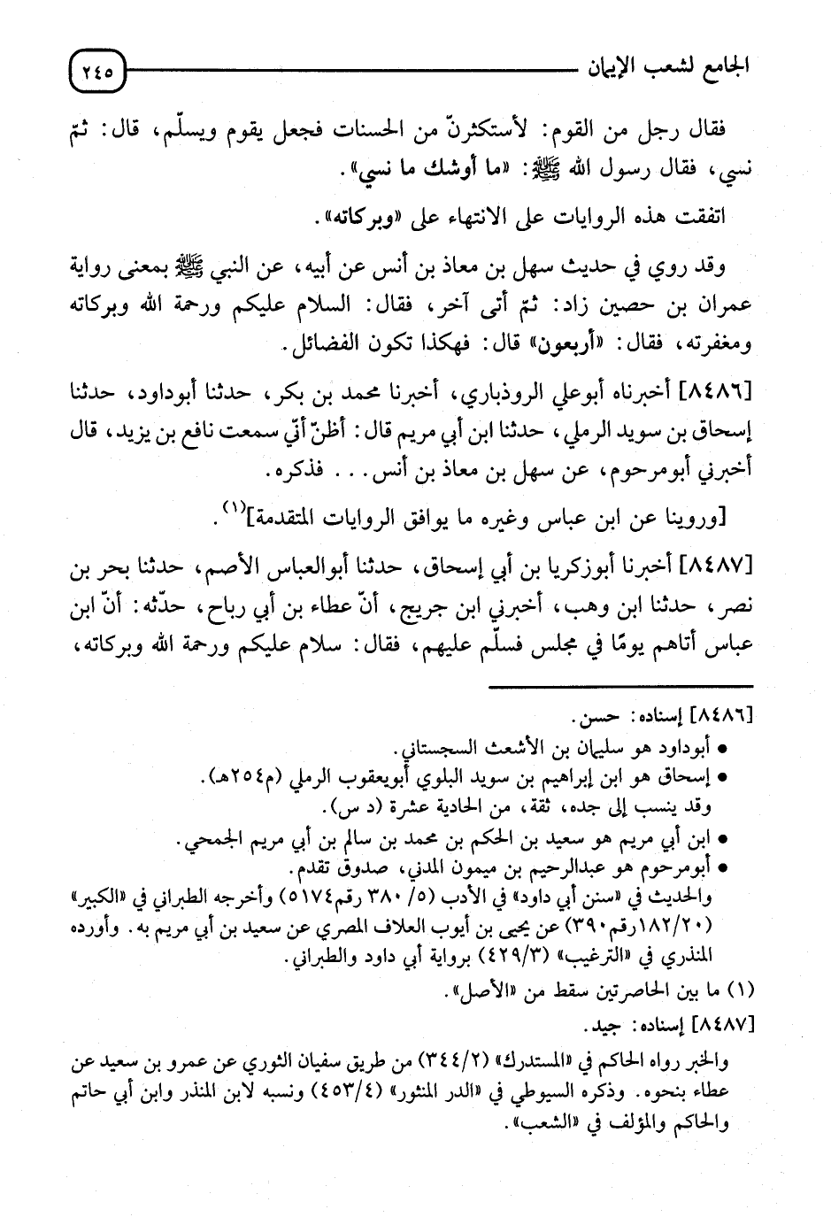 - وَقَدْ رُوِيَ فِي حَدِيثِ سَهْلِ بْنِ مُعَاذِ بْنِ أَنَسٍ، عَنْ أَبِيهِ، عَنِ النَّبِيِّ صَلَّى اللَّهُ عَلَيْهِ وَسَلَّمَ بِمَعْنَى رِوَايَةِ عِمْرَانَ بْنِ حُصَيْنٍ زَادَ ثُمَّ أَتَى آخَرُ، فَقَالَ: §السَّلَامُ عَلَيْكُمْ وَرَحْمَتُهُ وَبَرَكَاتُهُ وَمَغْفِرَتُهُ، فَقَالَ: " أَرْبَعُونَ "، قَالَ: فَهَكَذَا تَكُونُ الْفَضَائِلُ.