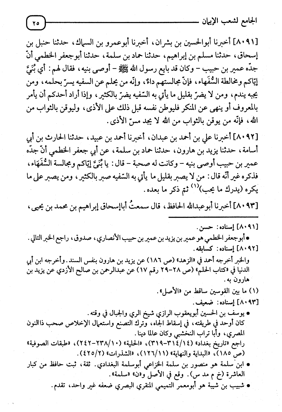 8091 - أَخْبَرَنَا أَبُو الْحُسَيْنِ بْنُ بِشْرَانَ، أنا أَبُو عَمْرِو بْنُ السَّمَّاكِ، نا حَنْبَلُ بْنُ إِسْحَاقَ، نا مُسْلِمُ بْنُ إِبْرَاهِيمَ، نا حَمَّادُ بْنُ سَلَمَةَ، نا أَبُو جَعْفَرٍ الْخَطْمِيُّ، أَنَّ جَدَّهُ عُمَيْرَ بْنَ حَبِيبٍ، وَكَانَ قَدْ بَايَعَ رَسُولَ اللهِ صَلَّى اللَّهُ عَلَيْهِ وَسَلَّمَ، أَوْصَى بَنِيهِ، فَقَالَ لَهُمْ: " أَيْ بَنِيَّ، §إِيَّاكُمْ وَمُخَالَطَةَ السُّفَهَاءِ، فَإِنَّ مُجَالَسَتَهُمْ دَاءٌ، وَلِأَنَّهُ مَنْ يَحْلُمْ عَنِ السَّفِيهِ يُسَرُّ بِحِلْمِهِ، وَمَنْ يُحِبُّهُ يَنْدَمْ، وَمَنْ لَا يُقِرُّ بِقَلِيلِ مَا يَأْتِي بِهِ السَّفِيهُ يُقِرُّ بِالْكَثِيرِ، وَإِذَا أَرَادَ أَحَدُكُمْ أَنْ يَأْمُرَ بِالْمَعْرُوفِ، أَوْ يُنْهَى عَنِ الْمُنْكَرِ فَلْيُوَطِّنْ نَفْسَهُ قَبْلَ ذَلِكَ عَلَى الْأَذَى، وَلْيُوقِنْ بِالثَّوَابِ مِنَ اللهِ فَإِنَّهُ يُوقِنُ بِالثَّوَابِ مِنَ اللهِ، فَإِنَّهُ لَا يَجِدُ مِنَ الْأَذَى بُدًّا "