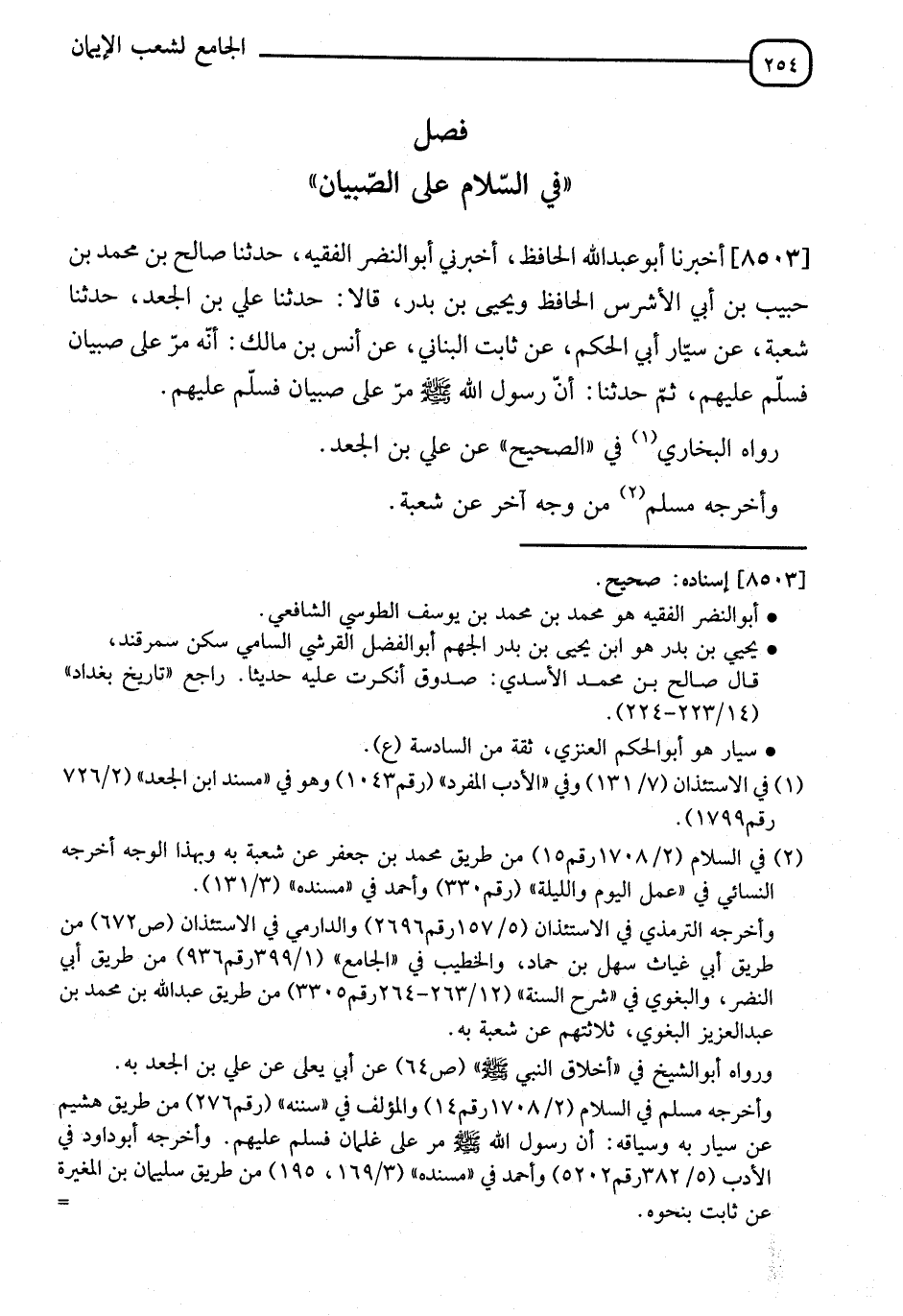 8503 - أَخْبَرَنَا أَبُو عَبْدِ اللهِ الْحَافِظُ، قَالَ: أَخْبَرَنِي أَبُو النَّضْرِ الْفَقِيهُ، قَالَ: نا صَالِحُ بْنُ مُحَمَّدِ بْنِ حَبِيبِ بْنِ أَبِي الْأَشْرَسِ الْحَافِظُ، وَيَحْيَى بْنُ بَدْرٍ، قَالَا: نا عَلِيُّ بْنُ الْجَعْدِ، قَالَ: أنا شُعْبَةُ، عَنْ سَيَّارٍ أَبِي الْحَكَمِ، عَنْ ثَابِتٍ الْبُنَانِيِّ، عَنْ أَنَسٍ، أَنَّهُ مَرَّ عَلَى صِبْيَانٍ فَسَلَّمَ عَلَيْهِمْ، ثُمَّ حَدَّثَنَا: " أَنَّ رَسُولَ اللهِ صَلَّى اللَّهُ عَلَيْهِ وَسَلَّمَ، §مَرَّ عَلَى صِبْيَانٍ فَسَلَّمَ عَلَيْهِمْ ". رَوَاهُ الْبُخَارِيُّ فِي الصَّحِيحِ، عَنْ عَلِيِّ بْنِ الْجَعْدِ. وَأَخْرَجَهُ مُسْلِمٌ مِنْ وَجْهٍ آخَرَ، عَنْ شُعْبَةَ