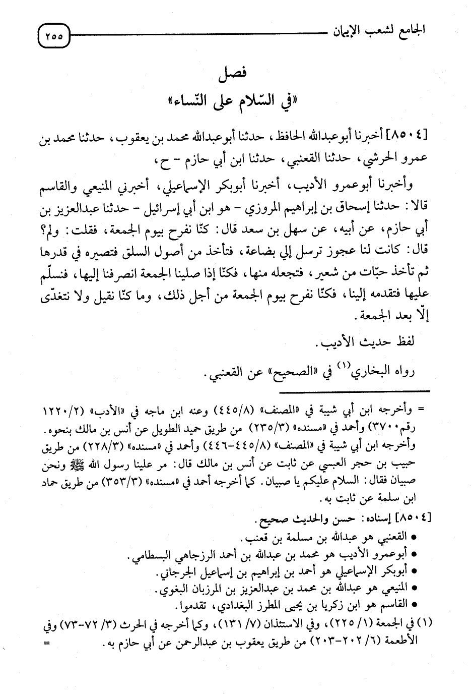 8504 - أَخْبَرَنَا أَبُو عَبْدِ اللهِ الْحَافِظُ، قَالَ: نا أَبُو عَبْدِ اللهِ مُحَمَّدُ بْنُ يَعْقُوبَ، قَالَ: نا مُحَمَّدُ بْنُ عَمْرٍو الْحَرَشِيُّ، قَالَ: نا الْقَعْنَبِيُّ، قَالَ: نا ابْنُ أَبِي حَازِمٍ، ح وَأَخْبَرَنَا أَبُو عَمْرٍو الْأَدِيبُ، قَالَ: أنا أَبُو بَكْرٍ الْإِسْمَاعِيلِيُّ، قَالَ: أَخْبَرَنِي الْمَنِيعِيُّ، وَالْقَاسِمُ، قَالَا: نا إِسْحَاقُ بْنُ إِبْرَاهِيمَ الْمَرْوَزِيُّ هُوَ ابْنُ أَبِي إِسْرَائِيلَ، قَالَ: نا عَبْدُ الْعَزِيزِ بْنُ أَبِي حَازِمٍ، عَنْ أَبِيهِ، عَنْ سَهْلِ بْنِ سَعْدٍ، قَالَ: " كُنَّا نَفْرَحُ بِيَوْمِ الْجُمُعَةِ "، فَقُلْتُ: وَلِمَ؟، قَالَ: §" كَانَتْ لَنَا عَجُوزٌ تُرْسِلُ إِلَيَّ بِضَاعَةً فَتَأْخُذُ مِنْ أُصُولِ السِّلْقِ فَتُصَيِّرُهُ فِي قِدْرِهَا، ثُمَّ تَأْخُذُ حَبَّاتٍ مِنْ شَعِيرٍ فَتَجْعَلُهُ فِيهَا، فَكُنَّا إِذَا صَلَّيْنَا الْجُمُعَةَ انْصَرَفْنَا إِلَيْهَا نُسَلِّمُ عَلَيْهَا فَتُقَدِّمُهُ إِلَيْنَا، فَكُنَّا نَفْرَحُ بِيَوْمِ الْجُمُعَةِ مِنْ أَجْلِ ذَلِكَ، وَمَا كُنَّا نَقْبَلُ، وَلَا نَتَغَدَّى إِلَّا بَعْدَ الْجُمُعَةِ ". لَفْظُ حَدِيثِ الْأَدِيبِ رَوَاهُ الْبُخَارِيُّ فِي الصَّحِيحِ، عَنِ الْقَعْنَبِيِّ، -[256]- وَالْحَدِيثُ وَرَدَ فِي الْعَجُوزِ الَّتِي هِيَ مِنَ الْقَوَاعِدِ