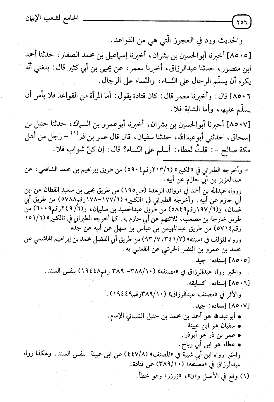 8505 - أَخْبَرَنَا أَبُو الْحُسَيْنِ بْنُ بِشْرَانَ، قَالَ: أنا إِسْمَاعِيلُ بْنُ مُحَمَّدٍ الصَّفَّارُ، قَالَ: نا أَحْمَدُ بْنُ مَنْصُورٍ، قَالَ: نا عَبْدُ الرَّزَّاقِ، قَالَ: أنا مَعْمَرٌ، عَنْ يَحْيَى بْنِ أَبِي كَثِيرٍ، قَالَ: " بَلَغَنِي أَنَّهُ §يُكْرَهُ أَنْ يُسَلِّمَ الرَّجُلُ عَلَى النِّسَاءِ، وَالنِّسَاءُ عَلَى الرَّجُلِ "