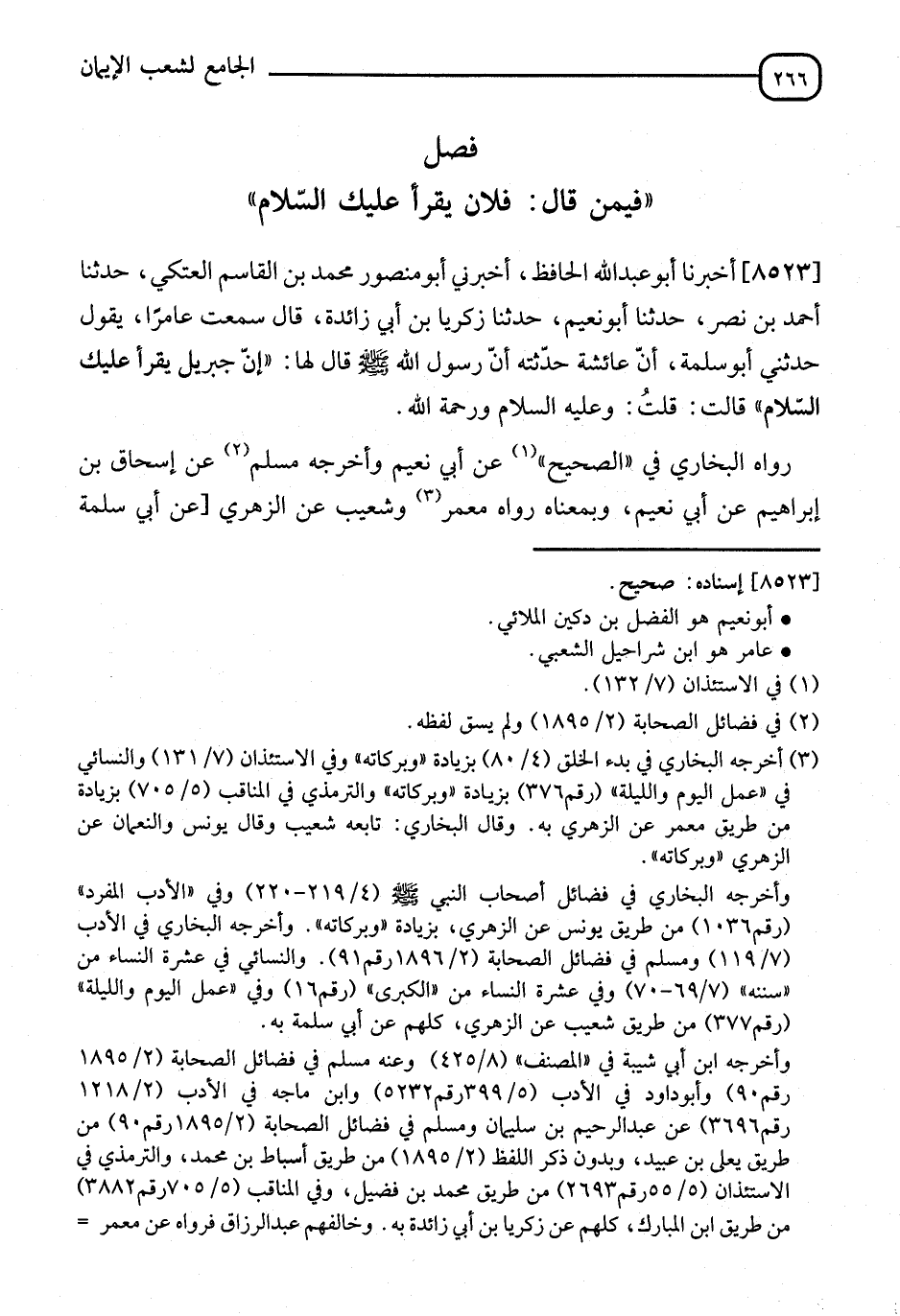 8523 - أَخْبَرَنَا أَبُو عَبْدِ اللهِ الْحَافِظُ، قَالَ: أَخْبَرَنِي أَبُو مَنْصُورٍ مُحَمَّدُ بْنُ الْقَاسِمِ الْعَتَكِيُّ، قَالَ: نا أَحْمَدُ بْنُ نَصْرٍ، قَالَ: نا أَبُو نُعَيْمٍ، نا زَكَرِيَّا بْنُ أَبِي زَائِدَةَ، قَالَ: سَمِعْتُ عَامِرًا، يَقُولُ: حَدَّثَنِي أَبُو سَلَمَةَ، أَنَّ عَائِشَةَ، حَدَّثَتْهُ، أَنَّ رَسُولَ اللهِ صَلَّى اللَّهُ عَلَيْهِ وَسَلَّمَ قَالَ لَهَا: " إِنَّ §جِبْرِيلَ يَقْرَأُ عَلَيْكِ السَّلَامَ "، قَالَتْ: قُلْتُ: وَعَلَيْهِ السَّلَامُ وَرَحْمَةُ اللهِ. وَبِمَعْنَاهُ رَوَاهُ مَعْمَرٌ، وَشُعَيْبٌ، عَنِ الزُّهْرِيِّ، عَنْ أَبِي سَلَمَةَ، -[267]- عَنْ عَائِشَةَ. قَالَ الْبُخَارِيُّ: وَقَالَ يُونُسُ، وَالنُّعْمَانُ عَنِ الزُّهْرِيِّ: وَبَرَكَاتُهُ