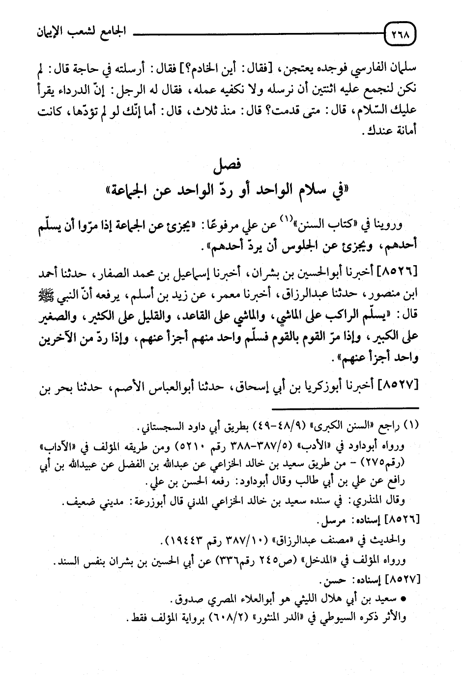 8527 - أَخْبَرَنَا أَبُو زَكَرِيَّا بْنُ أَبِي إِسْحَاقَ، قَالَ: نا أَبُو الْعَبَّاسِ الْأَصَمُّ، قَالَ: نا بَحْرُ بْنُ -[269]- نَصْرٍ، قَالَ: نا ابْنُ وَهْبٍ، قَالَ: أَخْبَرَنِي عَمْرُو بْنُ الْحَارِثِ، عَنْ سَعِيدِ بْنِ أَبِي هِلَالٍ اللَّيْثِيِّ، قَالَ: " §سَلَامُ الرَّجُلِ يُجْزِئُ عَنِ الْقَوْمِ، وَرَدُّ السَّلَامِ يُجْزِئُ عَنِ الْقَوْمِ "