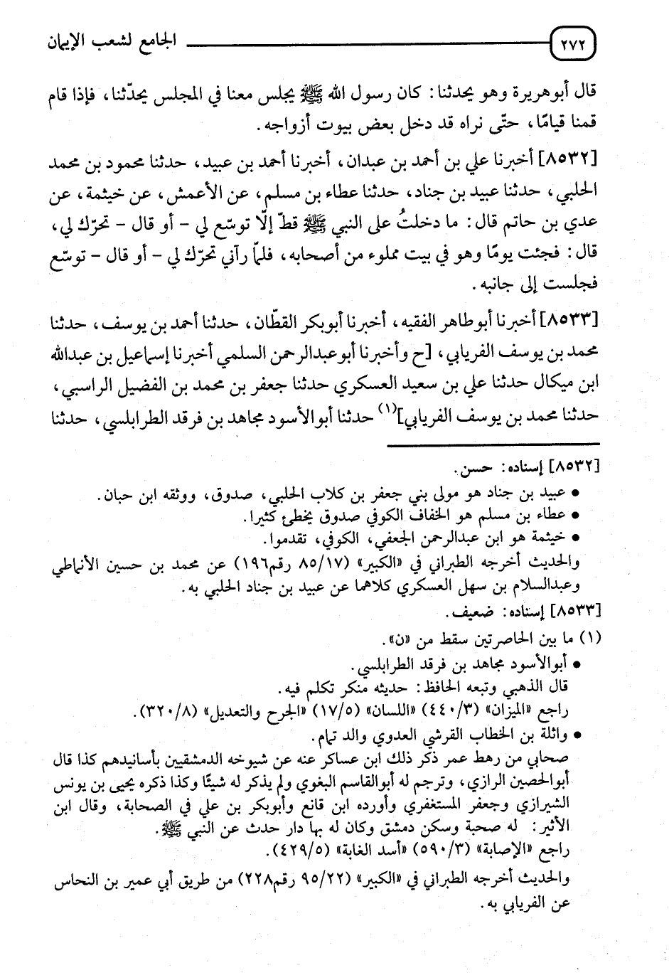 8533 - أَخْبَرَنَا أَبُو طَاهِرٍ الْفَقِيهُ، قَالَ: أنا أَبُو بَكْرٍ الْقَطَّانُ، قَالَ: نا أَحْمَدُ بْنُ يُوسُفَ، قَالَ: نا مُحَمَّدُ بْنُ يُوسُفَ الْفِرْيَابِيُّ، ح وَأَخْبَرَنَا أَبُو عَبْدِ الرَّحْمَنِ السُّلَمِيُّ، قَالَ: أنا إِسْمَاعِيلُ بْنُ عَبْدِ اللهِ الْمِيكَالِيُّ، قَالَ: نا عَلِيُّ بْنُ سَعِيدٍ الْعَسْكَرِيُّ، قَالَ: نا جَعْفَرُ بْنُ مُحَمَّدِ بْنِ الْفُضَيْلِ الرَّاسِبِيُّ، قَالَ: نا مُحَمَّدُ بْنُ يُوسُفَ الْفِرْيَابِيُّ، قَالَ: نا أَبُو الْأَسْوَدِ مُجَاهِدُ بْنُ فَرْقَدٍ الطَّرَابُلْسِيُّ، قَالَ: نا -[273]- وَاثِلَةُ بْنُ الْخَطَّابِ الْقُرَشِيُّ، قَالَ: دَخَلَ رَجُلٌ الْمَسْجِدَ وَالنَّبِيُّ صَلَّى اللَّهُ عَلَيْهِ وَسَلَّمَ وَحْدَهُ، فَتَحَرَّكَ لَهُ النَّبِيُّ صَلَّى اللَّهُ عَلَيْهِ وَسَلَّمَ فَقِيلَ لَهُ: يَا رَسُولَ اللهِ الْمَكَانُ وَاسِعٌ، فَقَالَ: " إِنَّ §لِلْمُؤْمِنِ حَقًّا ". " لَفْظُ حَدِيثِ السُّلَمِيِّ، وَقَدْ أَخْرَجْتُهُ فِي كِتَابِ الْمَدْخَلِ عَلَى لَفْظِ حَدِيثِ الْفَقِيهِ ". وَرَوَاهُ إِسْمَاعِيلُ بْنُ عَيَّاشٍ، عَنْ مُجَاهِدِ بْنِ فَرْقَدٍ