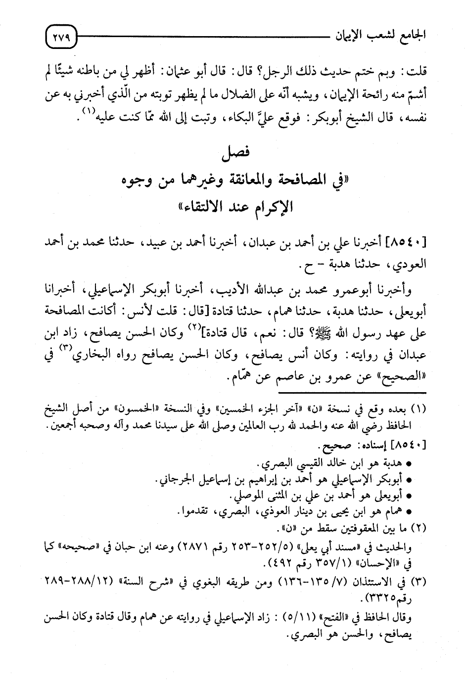 8540 - أَخْبَرَنَا عَلِيُّ بْنُ أَحْمَدَ بْنِ عَبْدَانَ، قَالَ: أنا أَحْمَدُ بْنُ عُبَيْدٍ، قَالَ: نا مُحَمَّدُ بْنُ أَحْمَدَ الْعَوْدِيُّ، قَالَ: نا هُدْبَةُ، ح وَأَخْبَرَنَا أَبُو عَمْرٍو مُحَمَّدُ بْنُ عَبْدِ اللهِ الْأَدِيبُ، قَالَ: أنا أَبُو بَكْرٍ الْإِسْمَاعِيلِيُّ، قَالَ: أنا أَبُو يَعْلَى، قَالَ: نا هُدْبَةُ، قَالَ: نا هَمَّامٌ، قَالَ: نا قَتَادَةُ، قَالَ: قُلْتُ لِأَنَسٍ: كَانَتِ §الْمُصَافَحَةُ عَلَى عَهْدِ رَسُولِ اللهِ صَلَّى اللَّهُ عَلَيْهِ وَسَلَّمَ؟، قَالَ: " نَعَمْ "