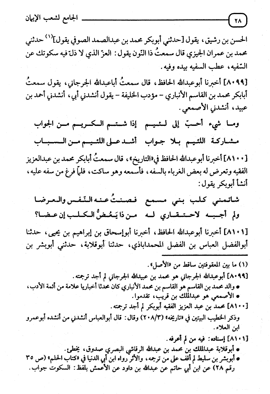 8099 - أَخْبَرَنَا أَبُو عَبْدِ اللهِ الْحَافِظُ، قَالَ: سَمِعْتُ أَبَا عَبْدِ اللهِ الْجُرْجَانِيَّ، يَقُولُ: سَمِعْتُ أَبَا بَكْرٍ مُحَمَّدَ بْنَ الْقَاسِمِ الْأَنْبَارِيَّ مُؤَدِّبَ الْخَلِيفَةِ، يَقُولُ: أَنْشِدْنِي أَحْمَدُ بْنُ عُبَيْدٍ، أَنْشِدْنِي الْأَصْمَعِيُّ:"