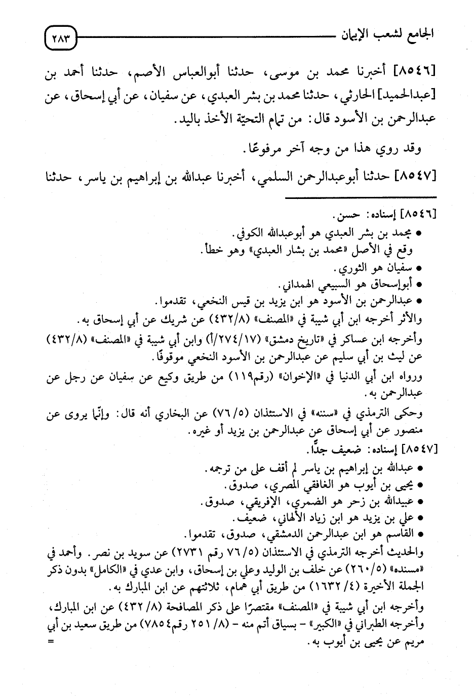 8546 - أَخْبَرَنَا أَبُو سَعِيدٍ مُحَمَّدُ بْنُ مُوسَى، قَالَ: نا أَبُو الْعَبَّاسِ الْأَصَمُّ، قَالَ: نا أَحْمَدُ بْنُ عَبْدِ الْحَمِيدِ الْحَارِثِيُّ، قَالَ: نا مُحَمَّدُ بْنُ بَشَّارٍ الْعَبْدِيُّ، عَنْ سُفْيَانَ، عَنْ أَبِي إِسْحَاقَ، عَنْ عَبْدِ الرَّحْمَنِ بْنِ الْأَسْوَدِ، قَالَ: §" مِنْ تَمَامِ التَّحِيَّةِ الْأَخْذُ بِالْيَدِ " " وَقَدْ رُوِيَ هَذَا مِنْ وَجْهٍ آخَرَ مَرْفُوعًا "