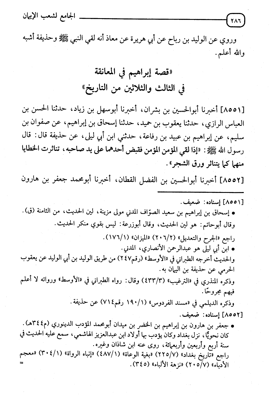 8551 - أَخْبَرَنَا أَبُو الْحُسَيْنِ بْنُ بِشْرَانَ، قَالَ: نا أَبُو سَهْلِ بْنُ زِيَادٍ، قَالَ: نا الْأَعْمَشُ بْنُ الْعَبَّاسِ الرَّازِيُّ، قَالَ: نا يَعْقُوبُ بْنُ حُمَيْدٍ، قَالَ: نا إِسْحَاقُ بْنُ إِبْرَاهِيمَ، عَنْ صَفْوَانَ بْنِ سُلَيْمٍ، عَنْ إِبْرَاهِيمَ بْنِ عُبَيْدِ بْنِ رِفَاعَةَ، قَالَ: حَدَّثَنِي ابْنُ أَبِي لَيْلَى، عَنْ حُذَيْفَةَ، قَالَ: قَالَ النَّبِيُّ صَلَّى اللَّهُ عَلَيْهِ وَسَلَّمَ: §" إِذَا لَقِيَ الْمُؤْمِنُ الْمُؤْمِنَ فَقَبَضَ أَحَدُهُمَا عَلَى يَدِ صَاحِبِهِ تَنَاثَرَتِ الْخَطَايَا مِنْهُمَا كَمَا تَنَاثَرُ أَوْرَاقُ الشَّجَرِ "