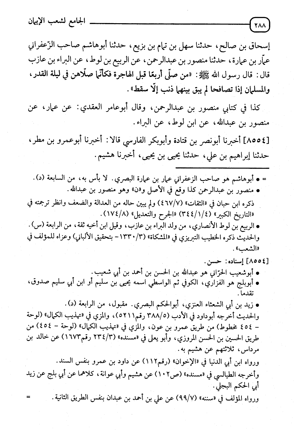 8554 - أَخْبَرَنَا أَبُو نَصْرِ بْنُ قَتَادَةَ، وَأَبُو بَكْرٍ الْفَارِسِيُّ، قَالَا: أنا أَبُو عَمْرِو بْنُ مَطَرٍ، قَالَ: نا إِبْرَاهِيمُ بْنُ عَلِيٍّ، قَالَ: نا يَحْيَى بْنُ يَحْيَى، قَالَ: أنا هُشَيْمٌ، -[289]- وَأَخْبَرَنَا أَبُو الْحَسَنِ عَلِيُّ بْنُ أَحْمَدَ بْنِ عَبْدَانَ، قَالَ: أنا أَحْمَدُ بْنُ عُبَيْدٍ الصَّفَّارُ، قَالَ: نا أَبُو شُعَيْبٍ الْحَرَّانِيُّ، قَالَ: نا دَاوُدُ بْنُ عَمْرٍو الضَّبِّيُّ، قَالَ: نا هُشَيْمُ بْنُ بَشِيرٍ، عَنْ أَبِي بَلْجٍ، قَالَ: حَدَّثَنِي زَيْدُ بْنُ أَبِي الشَّعْثَاءِ، عَنِ الْبَرَاءِ بْنِ عَازِبٍ، قَالَ: قَالَ رَسُولُ اللهِ صَلَّى اللَّهُ عَلَيْهِ وَسَلَّمَ: §" إِذَا الْتَقَى الْمُسْلِمَانِ فَتَصَافَحَا فَحَمِدَا اللهَ وَاسْتَغْفَرَاهُ غَفَرَ لَهُمَا " وَفِي رِوَايَةِ يَحْيَى، عَنْ زَيْدٍ أَبِي الْحَكَمِ، وَالْبَاقِي سَوَاءٌ