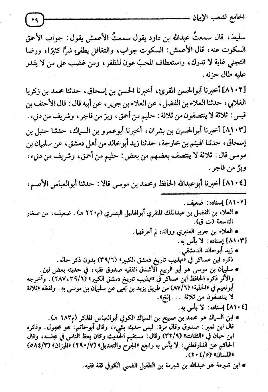 8103 - أَخْبَرَنَا أَبُو الْحُسَيْنِ بْنُ بِشْرَانَ، أنا أَبُو عَمْرِو بْنُ السَّمَّاكِ، نا حَنْبَلُ بْنُ إِسْحَاقَ، نا الْهَيْثَمُ بْنُ خَارِجَةَ، نا زَيْدٌ أَبُو خَالِدٍ مِنْ أَهْلِ دِمَشْقَ، عَنْ سُلَيْمِ بْنِ مُوسَى، قَالَ: " §ثَلَاثَةٌ لَا يَنْتَصِفُ بَعْضُهُمْ مِنْ بَعْضٍ: حَلِيمٌ مِنْ أَحْمَقَ، وَشَرِيفٌ مِنْ دَنِيءٍ، وَبَرٌّ مِنْ فَاجِرٍ "