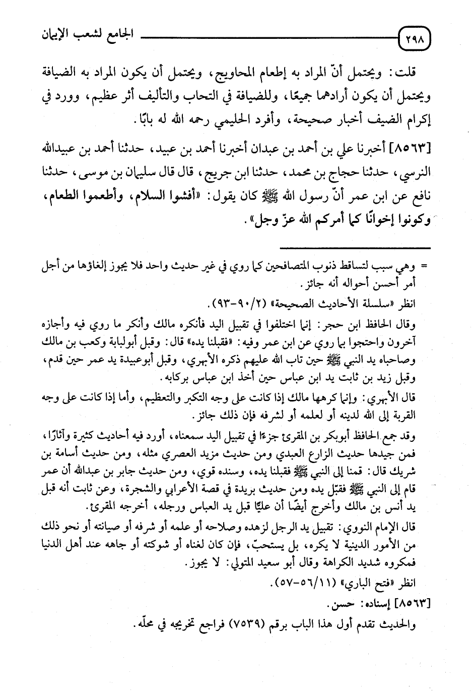 8563 - أَخْبَرَنَا عَلِيُّ بْنُ أَحْمَدَ بْنِ عَبْدَانَ، قَالَ: أنا أَحْمَدُ بْنُ عُبَيْدٍ، قَالَ: نا أَحْمَدُ بْنُ عُبَيْدِ اللهِ النَّرْسِيُّ، قَالَ: نا حَجَّاجُ بْنُ مُحَمَّدٍ، قَالَ: نا ابْنُ جُرَيْجٍ، قَالَ: قَالَ سُلَيْمَانُ بْنُ مُوسَى: نا نَافِعٌ، عَنِ ابْنِ عُمَرَ، أَنَّ رَسُولَ اللهِ صَلَّى اللَّهُ عَلَيْهِ وَسَلَّمَ كَانَ يَقُولُ: " §أَفْشُوا السَّلَامَ، وَأَطْعِمُوا الطَّعَامَ، وَكُونُوا إِخْوَانًا كَمَا أَمْرَكُمُ اللهُ عَزَّ وَجَلَّ "