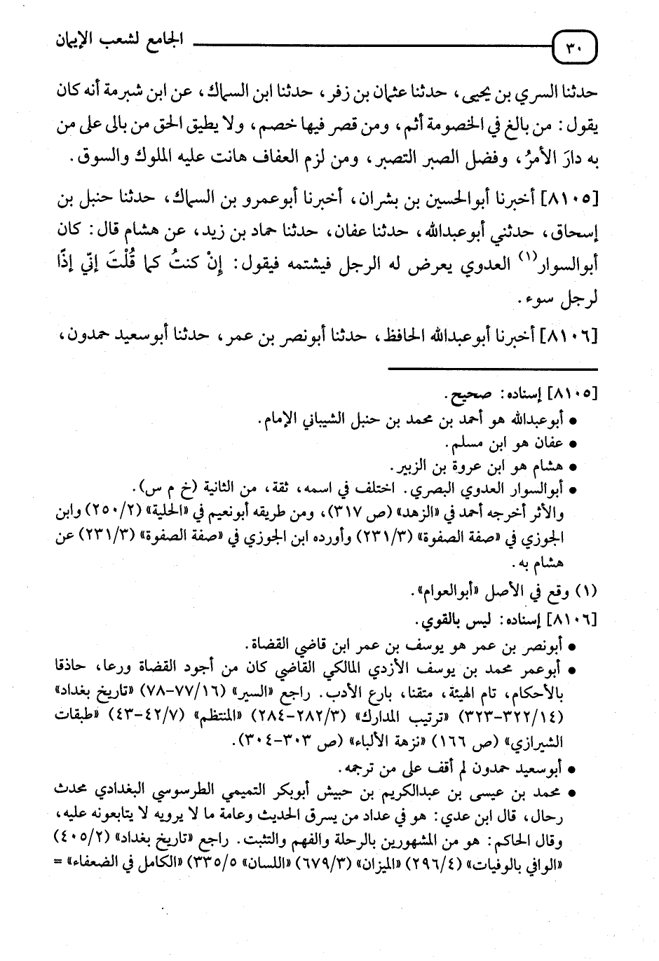 8105 - أَخْبَرَنَا أَبُو الْحُسَيْنِ بْنُ بِشْرَانَ، أنا أَبُو عَمْرِو بْنُ السَّمَّاكِ، نا حَنْبَلُ بْنُ إِسْحَاقَ، حَدَّثَنِي أَبُو عَبْدِ اللهِ، نا عَفَّانُ، نا حَمَّادُ بْنُ زَيْدٍ، عَنْ هِشَامٍ، قَالَ: كَانَ أَبُو الْعَوَّامِ الْعَدَوِيُّ §يَعْرِضُ لَهُ الرَّجُلُ فَيَشْتُمُهُ، فَيَقُولُ: " إِنْ كُنْتُ كَمَا قُلْتَ: إِنِّي إِذًا لَرَجُلُ سُوءٍ "