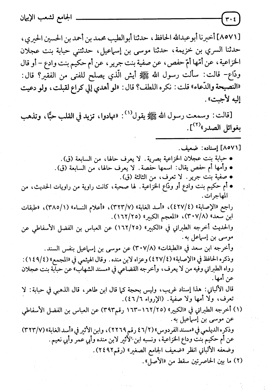 8571 - أَخْبَرَنَا أَبُو عَبْدِ اللهِ الْحَافِظُ، قَالَ: نا أَبُو الطَّيِّبِ مُحَمَّدُ بْنُ أَحْمَدَ بْنِ الْحُسَيْنِ الْحِيرِيُّ، قَالَ: نا السَّرِيُّ بْنُ خُزَيْمَةَ، قَالَ: نا مُوسَى بْنُ إِسْمَاعِيلَ، قَالَ: حَدَّثَتْنِي حُبَابَةُ بِنْتُ عَجْلَانَ الْخُزَاعِيَّةُ، عَنْ أُمِّهَا أُمِّ حَفْصٍ، عَنْ صَفِيَّةَ بِنْتِ جَرِيرٍ، عَنْ أُمِّ حَكِيمٍ بِنْتِ ذِرَاعٍ - أَوْ قَالَ وَدَاعٍ - قَالَتْ: سَأَلْتُ رَسُولَ اللهِ صَلَّى اللَّهُ عَلَيْهِ وَسَلَّمَ: إِيشِ الَّذِي يَصِحُّ لِلْغَنِيِّ مِنَ الْفَقِيرِ؟، قَالَ: " النَّصِيحَةُ وَالدُّعَاءُ "، قُلْتُ: يُكْرَهُ اللُّطْفُ؟، قَالَ: " §لَوْ أُهْدِيَ إِلَيَّ كُرَاعٌ لَقَبِلْتُ، وَلَوْ دُعِيتُ إِلَيْهِ لَأَجَبْتُ "