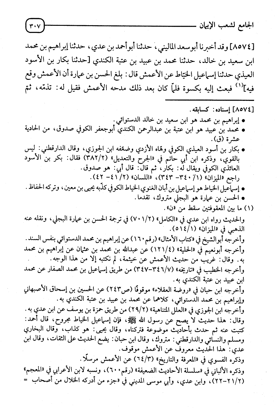 8574 - أَخْبَرَنَا أَبُو سَعْدٍ الْمَالِينِيُّ، قَالَ: أنا أَبُو أَحْمَدَ بْنُ عَدِيٍّ، قَالَ: نا إِبْرَاهِيمُ بْنُ مُحَمَّدِ بْنِ سَعِيدِ بْنِ خَالِدٍ، قَالَ: نا مُحَمَّدُ بْنُ عُبَيْدِ بْنِ عُتْبَةَ الْكِنْدِيُّ، قَالَ: نا بَكَّارُ بْنُ أَسْوَدَ الْعِيذِيُّ، قَالَ: نا إِسْمَاعِيلُ الْخَيَّاطُ، عَنِ الْأَعْمَشِ، قَالَ: بَلَغَ الْحَسَنَ بْنَ عُمَارَةَ أَنَّ الْأَعْمَشَ وَقَعَ فِيهِ، فَبَعَثَ إِلَيْهِ بِكِسْوَةٍ، فَلَمَّا كَانَ بَعْدَ ذَلِكَ مَدْحَهُ الْأَعْمَشُ، فَقِيلَ لَهُ: تَذُمُّهُ ثُمَّ -[308]- مَدَحْتَهُ؟، قَالَ: إِنَّ خَيْثَمَةَ حَدَّثَنِي، عَنْ عَبْدِ اللهِ بْنِ مَسْعُودٍ، عَنِ النَّبِيِّ صَلَّى اللَّهُ عَلَيْهِ وَسَلَّمَ، قَالَ: " إِنَّ §الْقُلُوبَ جُبِلَتْ عَلَى حُبِّ مَنْ أَحْسَنَ إِلَيْهَا، وَبُغْضِ مَنْ أَسَاءَ إِلَيْهَا ". قَالَ أَبُو أَحْمَدَ بْنُ عَدِيٍّ: " لَمْ أَكْتُبْهُ مَرْفُوعًا إِلَّا مِنْ هَذَا الشَّيْخِ، وَلَا أَدْرِي بِرَفْعِ هَذَا الْحَدِيثِ إِلَّا مِنْ هَذَا الْوَجْهِ، وَهُوَ مَعْرُوفٌ عَنِ الْأَعْمَشِ مَوْقُوفًا، قَالَ: وَمِنْ وُجُوهِ الْمُقَارَبَةِ تَوَدُّدُ بَعْضِهِمْ إِلَى بَعْضٍ بِمَا اسْتَطَاعَ مِنْ مَكَارِمِ الْأَخْلَاقِ، وَأَنْوَاعِ الْمَبَارِّ