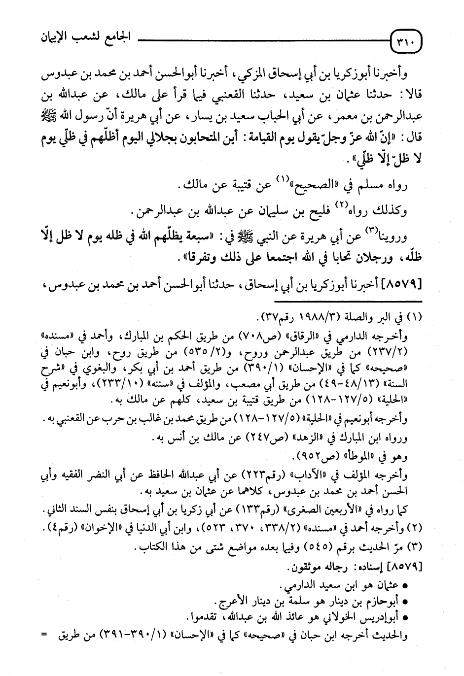 وَرُوِّينَا عَنْ أَبِي هُرَيْرَةَ، عَنِ النَّبِيِّ صَلَّى اللَّهُ عَلَيْهِ وَسَلَّمَ فِي: §" سَبْعَةٍ يُظِلُّهُمُ اللهُ فِي ظِلِّهِ يَوْمَ لَا ظِلَّ إِلَّا ظِلُّهُ: وَرَجُلَانِ تَحَابَّا فِي اللهِ، اجْتَمَعَا عَلَى ذَلِكَ، وَتَفَرَّقَا عَلَيْهِ "