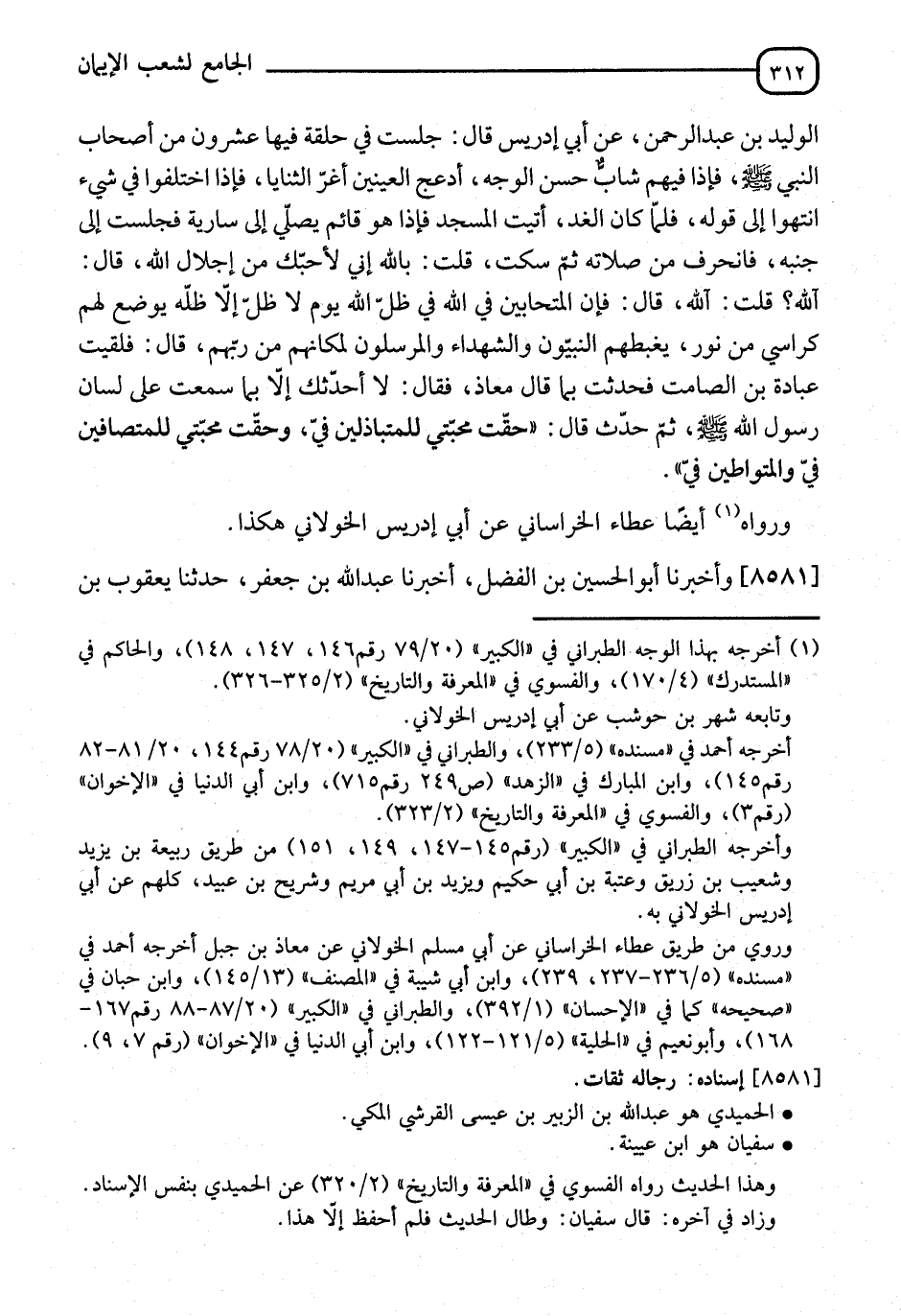 8581 - وَأَخْبَرَنَا أَبُو الْحُسَيْنِ بْنُ الْفَضْلِ، قَالَ: أنا عَبْدُ اللهِ بْنُ جَعْفَرٍ، قَالَ: نا يَعْقُوبُ بْنُ -[313]- سُفْيَانَ، قَالَ: نا الْحُمَيْدِيُّ، قَالَ: نا سُفْيَانُ، قَالَ: هَذَا الَّذِي حَفِظْنَا مِنَ الزُّهْرِيِّ، عَنْ أَبِي إِدْرِيسَ الْخَوْلَانِيِّ أَنَّهُ أَخْبَرَهُ قَالَ: أَدْرَكْتُ أَبَا الدَّرْدَاءِ وَوَعَيْتُ عَنْهُ، وَعُبَادَةَ بْنَ الصَّامِتِ وَوَعَيْتُ عَنْهُ، وَشَدَّادَ بْنَ أَوْسٍ وَوَعَيْتُ عَنْهُ، وَفَاتَنِي مُعَاذُ بْنُ جَبَلٍ، فَأَخْبَرَنِي فُلَانٌ عَنْهُ، قَالَ سُفْيَانُ: وَسَمَّاهُ الزُّهْرِيُّ فَنَسِيتُهُ: أَنَّ مُعَاذَ بْنَ جَبَلٍ كَانَ لَا يَجْلِسُ مَجْلِسًا إِلَّا قَالَ: " §اللهُ حَكَمٌ قِسْطٌ تَبَارَكَ اسْمُهُ، هَلَكَ الْمُرْتَابُونَ ". وَرَوَاهُ غَيْرُهُ عَنْ أَبِي إِدْرِيسَ، عَنْ يَزِيدَ بْنِ عَمِيرَةَ، عَنْ مُعَاذٍ، فَيُحْتَمَلَ أَنْ يَكُونَ الْحَدِيثُ الْأَوَّلُ فِي الْمُتَحَابِّينَ سَمِعَهُ أَيْضًا مِنْ يَزِيدَ بْنِ عَمِيرَةَ، عَنْ مُعَاذٍ، وَاللهُ أَعْلَمُ