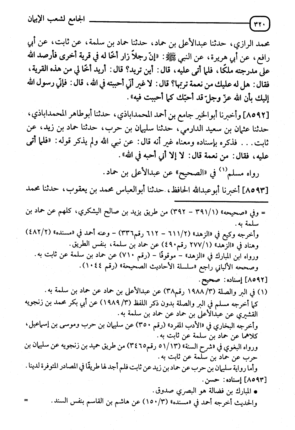 8593 - أَخْبَرَنَا أَبُو عَبْدِ اللهِ الْحَافِظُ، نا أَبُو الْعَبَّاسِ مُحَمَّدُ بْنُ يَعْقُوبَ، نا مُحَمَّدُ -[321]- بْنُ إِسْحَاقَ الصَّنْعَانِيُّ، نا هَاشِمُ بْنُ الْقَاسِمِ، نا الْمُبَارَكُ بْنُ فَضَالَةَ، نا ثَابِتٌ الْبُنَانِيُّ، عَنْ أَنَسِ بْنِ مَالِكٍ، أَنَّ رَجُلًا قَالَ لِلنَّبِيِّ صَلَّى اللَّهُ عَلَيْهِ وَسَلَّمَ: §إِنِّي أُحِبُّ فُلَانًا فِي اللهِ، فَقَالَ النَّبِيُّ صَلَّى اللَّهُ عَلَيْهِ وَسَلَّمَ: " فَأَخْبَرْتَهُ؟ "، قَالَ: لَا، قَالَ: " فَأَخْبِرْهُ " قَالَ: فَلَقِيَهُ بَعْدُ فَقَالَ: وَاللهِ إِنِّي لَأُحِبُّكَ فِي اللهِ، قَالَ: فَأَحَبَّكَ الَّذِي لَهُ أَحْبَبْتَنِي. تَابَعَهُ عَبْدُ اللهِ بْنُ الزُّبَيْرِ الْبَاهِلِيُّ، وَعُمَارَةُ بْنُ زَاذَانَ، عَنْ ثَابِتٍ، عَنْ أَنَسٍ. وَاخْتُلِفَ فِيهِ عَنْ حَمَّادِ بْنِ سَلَمَةَ. فَقِيلَ: عَنْهُ عَنْ ثَابِتٍ، عَنْ حَبِيبِ بْنِ سُبَيْعَةَ، عَنْ رَجُلٍ، حَدَّثَهُ، عَنِ النَّبِيِّ صَلَّى اللَّهُ عَلَيْهِ وَسَلَّمَ. وَقِيلَ: عَنْهُ، عَنْ ثَابِتٍ، عَنْ حَبِيبِ بْنِ سُبَيْعَةَ، عَنِ الْحَارِثِ، عَنْ رَجُلٍ حَدَّثَهُ سَمِعَ النَّبِيَّ صَلَّى اللَّهُ عَلَيْهِ وَسَلَّمَ، وَقِيلَ غَيْرُ ذَلِكَ، وَرُوِيَ مِنْ وَجْهٍ آخَرَ عَنْ أَنَسٍ