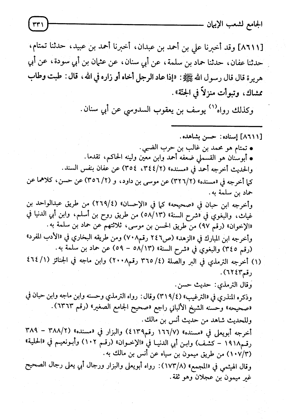 8611 - وَأَخْبَرَنَا عَلِيُّ بْنُ أَحْمَدَ بْنِ عَبْدَانَ، قَالَ: أنا أَحْمَدُ بْنُ عُبَيْدٍ، قَالَ: نا تَمْتَامٌ، نا عَفَّانُ، نا حَمَّادُ بْنُ سَلَمَةَ، عَنْ أَبِي سِنَانٍ، عَنْ عُثْمَانَ بْنِ أَبِي سَوْدَةَ، عَنْ أَبِي هُرَيْرَةَ، قَالَ: قَالَ رَسُولُ اللهِ صَلَّى اللَّهُ عَلَيْهِ وَسَلَّمَ: " إِذَا عَادَ الرَّجُلُ أَخَاهُ، أَوْ زَارَهُ فِي اللهِ، قَالَ اللهُ: §طِبْتَ، وَطَابَ مَمْشَاكَ، وَتَبَوَّأْتَ مَنْزِلًا فِي الْجَنَّةِ ". وَكَذَلِكَ رَوَاهُ يُوسُفُ بْنُ يَعْقُوبَ السَّدُوسِيُّ، عَنْ أَبِي سِنَانٍ