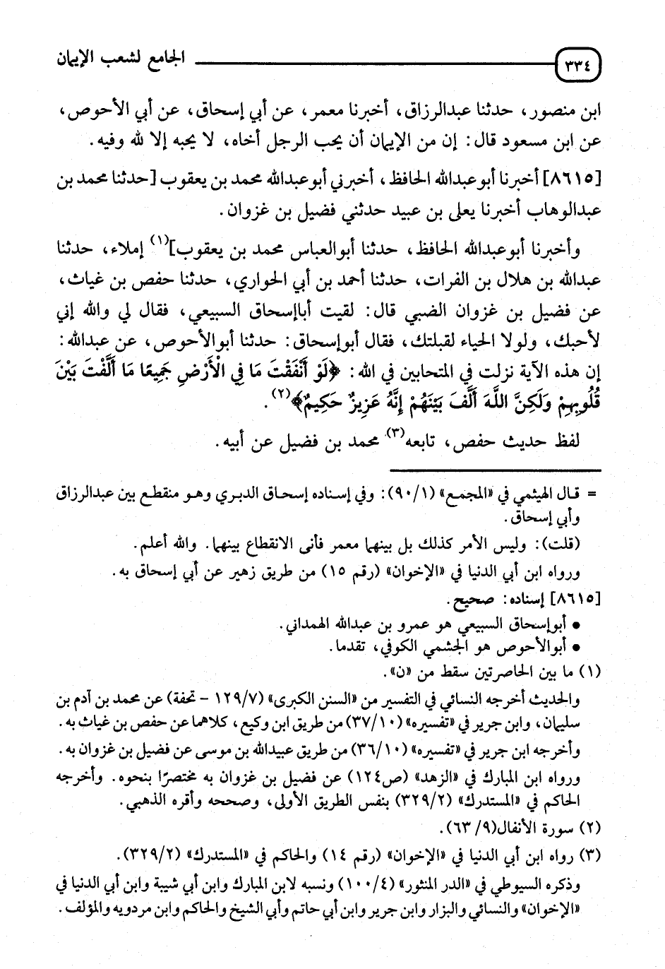 8615 - أَخْبَرَنَا أَبُو عَبْدِ اللهِ الْحَافِظُ، قَالَ: أَخْبَرَنِي أَبُو عَبْدِ اللهِ مُحَمَّدُ بْنُ يَعْقُوبَ، قَالَ: نا مُحَمَّدُ بْنُ عَبْدِ الْوَهَّابِ، قَالَ: أنا يَعْلَى بْنُ عُبَيْدٍ، قَالَ: حَدَّثَنِي فُضَيْلُ بْنُ غَزْوَانَ، وَأَخْبَرَنَا أَبُو عَبْدِ اللهِ الْحَافِظُ، قَالَ: نا أَبُو عَبْدُ اللهِ مُحَمَّدُ بْنُ يَعْقُوبَ إِمْلَاءً، قَالَ: نا عَبْدُ اللهِ بْنُ هِلَالِ بْنِ الْفُرَاتِ، قَالَ: نا أَحْمَدُ بْنُ أَبِي الْحَوَارِيِّ، قَالَ: نا حَفْصُ بْنُ غِيَاثٍ، عَنْ فُضَيْلِ بْنِ غَزْوَانَ الضَّبِّيِّ، قَالَ: لَقِيَنِي أَبُو إِسْحَاقَ السَّبِيعِيُّ، فَقَالَ لِي: " §إِنِّي وَاللهِ لَأُحِبُّكَ، وَلَوْلَا الْحَيَاءُ لَقَبَّلْتُكَ ". فَقَالَ أَبُو إِسْحَاقَ: نا أَبُو الْأَحْوَصِ، عَنْ عَبْدِ اللهِ: " أَنَّ هَذِهِ الْآيَةَ نَزَلَتْ فِي الْمُتَحَابِّينَ فِي اللهِ {لَوْ أَنْفَقْتَ مَا فِي الْأَرْضِ جَمِيعًا مَا أَلَّفْتَ بَيْنَ قُلُوبِهِمْ وَلَكِنَّ اللهَ أَلَّفَ بَيْنَهُمْ إِنَّهُ عَزِيزٌ حَكِيمٌ} [الأنفال: 63] ". لَفْظُ حَدِيثِ حَفْصٍ، تَابَعَهُمَا مُحَمَّدُ بْنُ فُضَيْلٍ، عَنْ أَبِيهِ