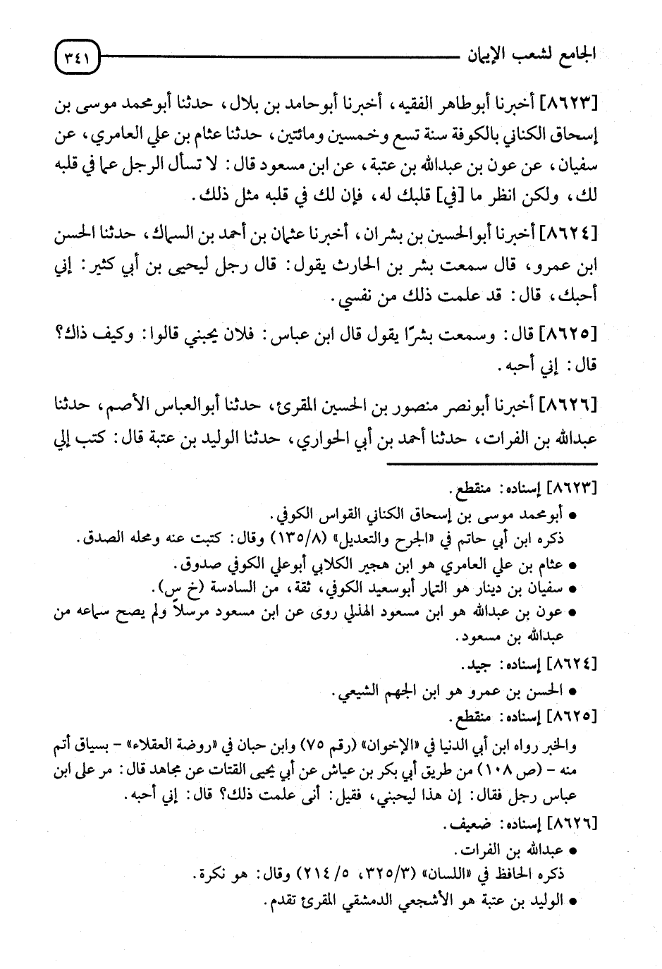 8623 - أَخْبَرَنَا أَبُو طَاهِرٍ الْفَقِيهُ، أنا أَبُو حَامِدِ بْنُ بِلَالٍ، قَالَ: نا أَبُو مُحَمَّدٍ مُوسَى بْنُ إِسْحَاقَ الْكِنَانِيُّ، بِالْكُوفَةِ سَنَةَ تِسْعٍ وَخَمْسِينَ وَمِائَتَيْنِ، قَالَ: نا عَلِيُّ بْنُ عَثَّامِ بْنِ عَلِيٍّ الْعَامِرِيُّ، عَنْ سُفْيَانَ، عَنْ عَوْنِ بْنِ عَبْدِ اللهِ بْنِ عُتْبَةَ، عَنِ ابْنِ مَسْعُودٍ، قَالَ: " §لَا تَسْأَلِ الرَّجُلَ عَمَّا فِي قَلْبِهِ لَكَ، وَلَكِنِ انْظُرْ مَا فِي قَلْبِكَ لَهُ، فَإِنَّ لَكَ فِي قَلْبِهِ مِثْلَ ذَلِكَ "