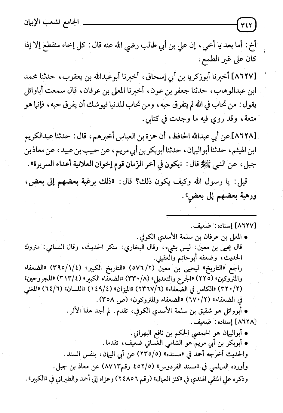 8627 - أَخْبَرَنَا أَبُو زَكَرِيَّا، قَالَ: أنا أَبُو عَبْدِ اللهِ بْنُ يَعْقُوبَ، قَالَ: أنا مُحَمَّدُ بْنُ عَبْدِ الْوَهَّابِ، قَالَ: أنا جَعْفَرُ بْنُ عَوْنٍ، قَالَ: أنا الْمُعَلَّى بْنُ عِرْفَانَ، قَالَ: سَمِعْتُ أَبَا وَائِلٍ، يَقُولُ: " §مَنْ تَحَابَّ فِي اللهِ لَمْ يَتَفَرَّقْ حُبُّهُ، وَمَنْ تَحَابَّ لِلدُّنْيَا فَيُوشِكُ أَنْ يَغْرَقَ حُبُّهُ، فَإِنَّمَا هُوَ مُتْعَةٌ "