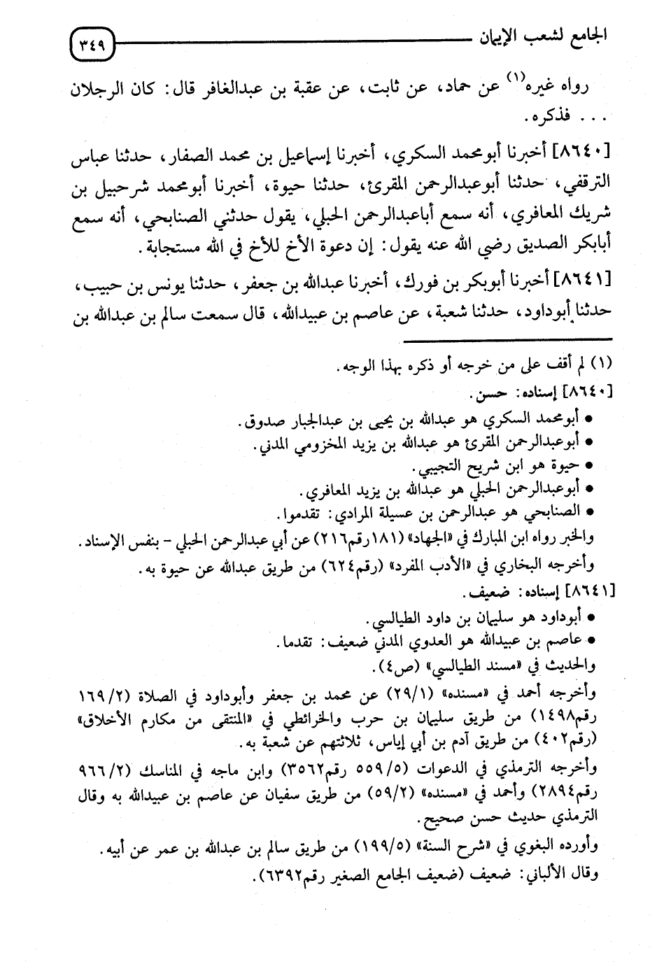 8640 - أَخْبَرَنَا أَبُو مُحَمَّدٍ السُّكَّرِيُّ، قَالَ: أنا إِسْمَاعِيلُ الصَّفَّارُ، نا عَبَّاسٌ التَّرْفُقِيُّ، نا أَبُو عَبْدِ الرَّحْمَنِ الْمُقْرِئُ، قَالَ: نا حَيْوَةُ، أنا أَبُو مُحَمَّدٍ شُرَحْبِيلُ بْنُ شَرِيكٍ الْمَغَافِرِيُّ، أَنَّهُ سَمِعَ أَبَا عَبْدِ الرَّحْمَنِ الْحُبُلِيَّ، يَقُولُ: حَدَّثَنِي الصُّنَابِحِيّ، أَنَّهُ سَمِعَ أَبَا بَكْرٍ الصِّدِّيقَ رَضِيَ اللهُ عَنْهُ يَقُولُ: " إِنَّ §دَعْوَةَ الْأَخِ لِلْأَخِ فِي اللهِ مُسْتَجَابَةٌ "