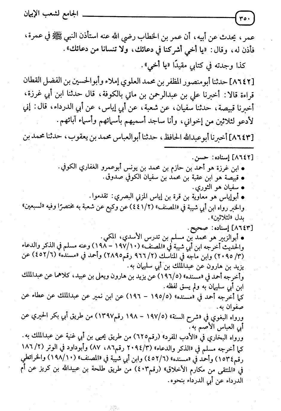 8642 - حَدَّثَنَا أَبُو مَنْصُورٍ الظَّفَرُ بْنُ مُحَمَّدٍ الْعَلَوِيُّ إِمْلَاءً، وَأَبُو الْحُسَيْنِ بْنُ الْفَضْلِ الْقَطَّانُ قَرَأَهُ، قَالَا: أنا عَلِيُّ بْنُ عَبْدِ الرَّحْمَنِ بْنِ مَاتِي بِالْكُوفَةِ قَالَ: نا ابْنُ أَبِي غَرَزَةَ، أنا قَبِيصَةُ، نا سُفْيَانُ، عَنْ شُعْبَةَ، عَنْ أَبِي إِيَاسٍ، عَنْ أَبِي الدَّرْدَاءِ، قَالَ: " §إِنِّي لَأَدْعُو لِثَلَاثِينَ مِنْ إِخْوَانِي وَأَنَا سَاجِدٌ، أُسَمِّيَهُمْ بِأَسْمَائِهِمْ، وَأَسْمَاءِ آبَائِهِمْ "