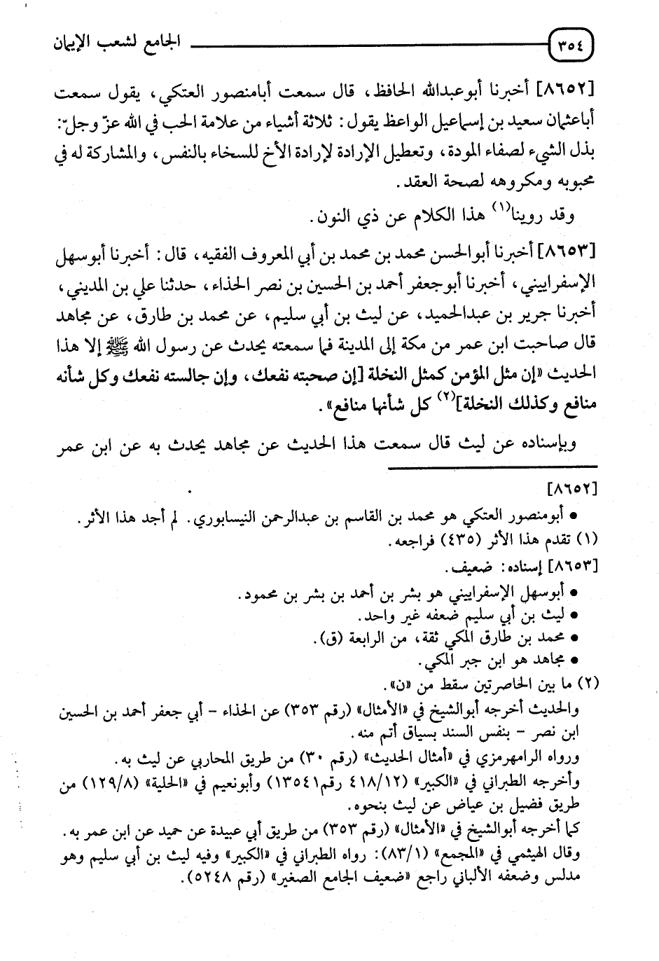 8653 - أَخْبَرَنَا أَبُو الْحَسَنِ مُحَمَّدُ بْنُ مُحَمَّدِ بْنِ أَبِي الْمَعْرُوفِ الْفَقِيهُ، قَالَ: أنا أَبُو سَهْلٍ الْإِسْفَرَايِينِيُّ، أنا أَبُو جَعْفَرٍ أَحْمَدُ بْنُ الْحُسَيْنِ بْنِ نَصْرٍ الْحَذَّاءُ، نا عَلِيُّ بْنُ الْمَدِينِيِّ، أنا جَرِيرُ بْنُ عَبْدِ الْحَمِيدِ، عَنْ لَيْثِ بْنِ أَبِي سُلَيْمٍ، عَنْ مُحَمَّدِ بْنِ طَارِقٍ، عَنْ مُجَاهِدٍ، قَالَ: صَاحَبْتُ ابْنَ عُمَرَ مِنْ مَكَّةَ إِلَى الْمَدِينَةِ فَمَا سَمِعْتُهُ يُحَدِّثُ عَنْ رَسُولِ اللهِ صَلَّى اللَّهُ عَلَيْهِ وَسَلَّمَ إِلَّا هَذَا الْحَدِيثَ: " إِنَّ §مَثَلَ الْمُؤْمِنِ كَمَثَلِ النَّخْلَةِ، إِنْ صَاحَبْتَهُ نَفَعَكَ، وَإِنْ شَاوَرْتَهُ نَفَعَكَ، وَإِنْ جَالَسْتَهُ نَفَعَكَ، وَكُلُّ شَأْنِهِ مَنَافِعُ، وَكَذَلِكَ النَّخْلَةُ كُلُّ شَأْنِهَا مَنَافِعُ ". وَبِإِسْنَادِهِ عَنْ لَيْثٍ، قَالَ: سَمِعْتُ هَذَا الْحَدِيثَ، عَنْ مُجَاهِدٍ، يُحَدِّثُ بِهِ عَنِ ابْنِ عُمَرَ، -[355]- وَلَكِنْ أَخْبَرَنِي مُحَمَّدُ بْنُ طَارِقٍ، أَنَّهُ كَانَ يُحَدِّثُ بِهِ عَنْ رَسُولِ اللهِ صَلَّى اللَّهُ عَلَيْهِ وَسَلَّمَ