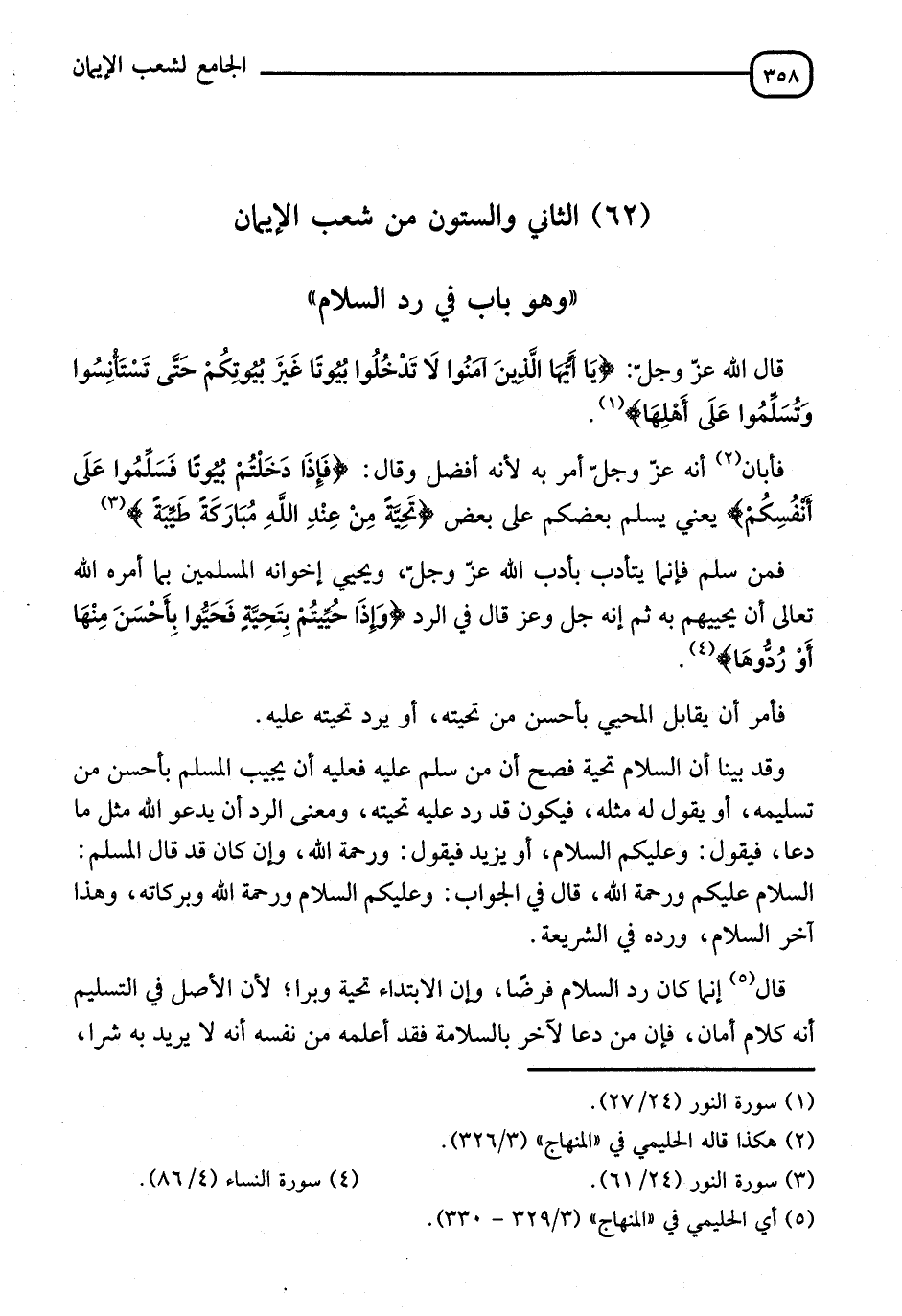 §الثَّانِي وَالسِّتُّونَ مِنْ شُعَبِ الْإِيمَانِ وَهُوَ بَابٌ فِي رَدِّ السَّلَامِ " قَالَ اللهُ عَزَّ وَجَلَّ: {يَا أَيُّهَا الَّذِينَ آمَنُوا لَا تَدْخُلُوا بُيُوتًا غَيْرَ بُيُوتِكُمْ حَتَّى تَسْتَأْنِسُوا وَتُسَلِّمُوا عَلَى أَهْلِهَا} [النور: 27] فَأَبَانَ أَنَّهُ جَلَّ وَعَزَّ أَمَرَ بِهِ لِأَنَّهُ أَفْضَلُ، وَقَالَ: {إِذَا دَخَلْتُمْ بُيُوتًا فَسَلِّمُوا عَلَى أَنْفُسِكُمْ}، يَعْنِي: يُسَلِّمُ بَعْضُكُمْ عَلَى بَعْضٍ تَحِيَّةً مِنْ عِنْدِ اللهِ مُبَارَكَةً طَيِّبَةً، فَمَنْ سَلَّمَ فَإِنَّمَا يَتَأَدَّبُ بِأَدَبِ اللهِ جَلَّ ثَنَاؤُهُ، وَيُحَيِّي إِخْوَانَهُ الْمُسْلِمِينَ بِمَا أَمَرهُ اللهُ تَعَالَى أَنْ يُحَيِّيَهُمْ بِهِ، ثُمَّ إِنَّهُ جَلَّ وَعَزَّ قَالَ فِي الرَّدِّ: {وَإِذَا حُيِّيتُمْ بِتَحِيَّةٍ فَحَيُّوا بِأَحْسَنَ مِنْهَا أَوْ رُدُّوهَا} [النساء: 86]، فَأَمَرَ أَنْ يُعَامَلَ الْمُحَيِّي بِأَحْسَنَ مِنْ تَحِيَّتِهِ أَوْ يَرُدَّ تَحِيَّتَهُ عَلَيْهِ، وَقَدْ بَيَّنَا أَنَّ السَّلَامَ تَحِيَّةٌ، فَصَحَّ أَنَّ مَنْ سَلَّمَ عَلَيْهِ فَعَلَيْهِ أَنْ يُجِيبَ الْمُسْلِمَ بِأَحْسَنَ مِنْ تَسْلِيمِهِ أَوْ يَقُولَ لَهُ مِثْلَهُ، فَيَكُونَ قَدْ رَدَّ عَلَيْهِ تَحِيَّتَهُ، وَمَعْنَى الرَّدِّ أَنْ يَدْعُوَ لَهُ مِثْلَ مَا دَعَا، فَيَقُولَ: وَعَلَيْكُمُ السَّلَامُ، أَوْ يَزِيدَ فَيَقُولَ: وَرَحْمَةُ اللهِ، وَإِنْ كَانَ قَدْ قَالَ الْمُسْلِمُ: السَّلَامُ عَلَيْكُمْ وَرَحْمَةُ اللهِ قَالَ فِي الْجَوَابِ: وَعَلَيْكُمُ السَّلَامُ وَرَحْمَةُ اللهِ وَبَرَكَاتُهُ، وَهَذَا حَدُّ السَّلَامِ وَرَدُّهُ فِي الشَّرِيعَةِ، قَالَ: وَإِنَّمَا كَانَ رَدُّ السَّلَامِ فَرْضًا وَإِنْ كَانَ الِابْتِدَاءُ تَحِيَّةً وَبِرًّا لِأَنَّ الْأَصْلَ فِي التَّسْلِيمِ أَنَّهُ كَلَامُ أَمَانٍ كَانَ مَنْ دَعَا لَآخَرَ بِالسَّلَامَةِ، فَقَدْ أَعْلَمُهُ مِنْ نَفْسِهِ أَنَّهُ لَا يُرِيدُ بِهِ شَرًّا،