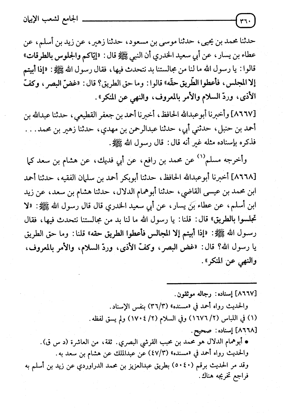 8668 - أَخْبَرَنَا أَبُو عَبْدِ اللهِ الْحَافِظُ، نا أَبُو بَكْرٍ أَحْمَدُ بْنُ سَلْمَانَ الْفَقِيهُ، نا أَحْمَدُ بْنُ مُحَمَّدِ بْنِ عِيسَى الْقَاضِي، نا أَبُو هَمَّامٍ الدَّلَّالُ، نا هِشَامُ بْنُ سَعْدٍ، عَنْ زَيْدِ بْنِ أَسْلَمَ، عَنْ عَطَاءِ بْنِ يَسَارٍ، عَنْ أَبِي سَعِيدٍ الْخُدْرِيِّ، قَالَ: قَالَ رَسُولُ اللهِ صَلَّى اللَّهُ عَلَيْهِ وَسَلَّمَ: " لَا تَجْلِسُوا بِالطَّرِيقِ "، قَالَ: قُلْنَا: يَا رَسُولَ اللهِ مَا لَنَا بُدٌّ مِنْ مَجَالِسِنَا نَتَحَدَّثُ فِيهَا، فَقَالَ رَسُولُ اللهِ صَلَّى اللَّهُ عَلَيْهِ وَسَلَّمَ: " إِذَا أَبَيْتُمْ إِلَّا الْمَجَالِسَ فَأَعْطُوا الطَّرِيقَ حَقَّهُ "، قُلْنَا: وَمَا §حَقُّ الطَّرِيقِ يَا رَسُولَ اللهِ؟، قَالَ: " غَضُّ الْبَصَرِ، وَكَفُّ الْأَذَى، وَرَدُّ السَّلَامِ، وَالْأَمْرُ بِالْمَعْرُوفِ، وَالنَّهْيُ عَنِ الْمُنْكَرِ "