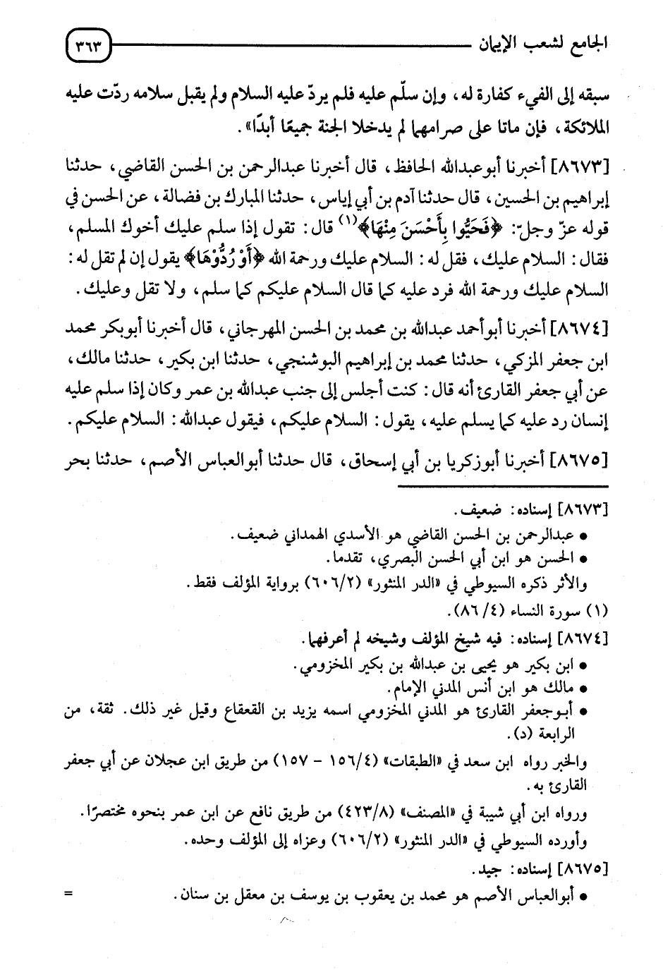 8673 - أَخْبَرَنَا أَبُو عَبْدِ اللهِ الْحَافِظُ، أنا عَبْدُ الرَّحْمَنِ بْنُ الْحَسَنِ الْقَاضِي، قَالَ: نا إِبْرَاهِيمُ بْنُ الْحُسَيْنِ، قَالَ: نا آدَمُ بْنُ أَبِي إِيَاسٍ، قَالَ: نا الْمُبَارَكُ بْنُ فَضَالَةَ، عَنِ الْحَسَنِ، فِي قَوْلِهِ عَزَّ وَجَلَّ: فَحَيُّوا بِأَحْسَنَ مِنْهَا قَالَ: يَقُولُ: " §إِذَا سَلَّمَ عَلَيْكَ أَخُوكَ الْمُسْلِمُ فَقَالَ: السَّلَامُ عَلَيْكَ، فَقُلْ لَهُ: السَّلَامُ عَلَيْكَ وَرَحْمَةُ اللهِ، أَوْ رُدَّهَا، تَقُولُ إِنْ لَمْ يَقُلْ لَكَ: السَّلَامُ عَلَيْكَ وَرَحْمَةُ اللهِ، فَرُدَّ عَلَيْهِ كَمَا قَالَ: السَّلَامُ عَلَيْكُمْ، كَمَا سَلَّمَ، وَلَا تَقُلْ: وَعَلَيْكَ "
