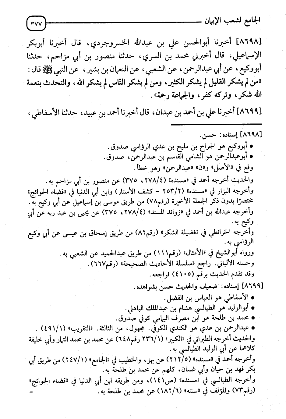 8698 - وَأَخْبَرَنَا أَبُو الْحَسَنِ عَلِيُّ بْنُ عَبْدِ اللهِ الْخُسْرَوْجِرْدِيُّ، قَالَ: أنا أَبُو بَكْرٍ الْإِسْمَاعِيلِيُّ، قَالَ: أَخْبَرَنِي مُحَمَّدُ بْنُ السَّرِيِّ، نا مَنْصُورُ بْنُ أَبِي مُزَاحِمٍ، أنا أَبُو وَكِيعٍ، عَنْ أَبِي عَبْدِ الرَّحْمَنِ، عَنِ الشَّعْبِيِّ، عَنِ النُّعْمَانِ بْنِ بَشِيرٍ، عَنِ النَّبِيِّ صَلَّى اللَّهُ عَلَيْهِ وَسَلَّمَ قَالَ: " §مَنْ لَمْ يَشْكُرِ الْقَلِيلَ، لَمْ يَشْكُرِ الْكَثِيرَ، وَمَنْ لَمْ يَشْكُرِ النَّاسَ، لَمْ يَشْكُرِ اللهَ، وَالتَّحَدُّثُ بِنِعْمَةِ اللهِ شُكْرٌ، وَتَرْكُهُ كُفْرٌ، وَالْجَمَاعَةُ رَحْمَةٌ "