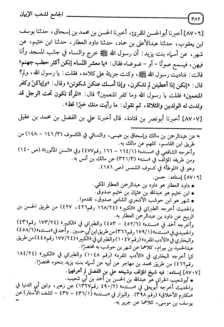 8706 - أَخْبَرَنَا أَبُو الْحَسَنِ الْمُقْرِئُ، أنا الْحَسَنُ بْنُ مُحَمَّدِ بْنِ إِسْحَاقَ، نا يُوسُفُ بْنُ يَعْقُوبَ، نا عَبْدُ الْأَعْلَى بْنُ حَمَّادٍ، نا دَاوُدُ الْعَطَّارُ، نا ابْنُ خُثَيْمٍ، عَنْ شَهْرٍ، عَنْ أَسْمَاءَ بِنْتِ يَزِيدَ، أَنَّ رَسُولَ اللهِ صَلَّى اللَّهُ عَلَيْهِ وَسَلَّمَ خَرَجَ وَالنِّسَاءُ فِي جَانِبِ الْمَسْجِدِ وَأَنَا فِيهِنَّ، فَسَمِعَ صَوْتًا - أَوْ ضَوْضَاءَ - فَقَالَ: " يَا مَعْشَرَ النِّسَاءِ، §إِنَّكُنَّ أَكْثَرُ حَطَبِ جَهَنَّمَ "، قَالَتْ: فَنَادَيْتُ رَسُولَ اللهِ صَلَّى اللَّهُ عَلَيْهِ وَسَلَّمَ وَكُنْتُ جَرِيَّةً عَلَى كَلَامِهِ فَقُلْتُ: يَا رَسُولَ اللهِ، وَلِمَ؟ قَالَ: " إِنَّكُنَّ إِذَا أُعْطِيتُنَّ لَمْ تَشْكُرْنَ، وَإِذَا أُمْسِكَ عَنْكُنَّ شَكَوْتُنَّ "، وَقَالَ: " إِيَّاكُنَّ وَكُفْرَ الْمُنَعَّمِينَ "، فَقُلْتُ: يَا رَسُولَ اللهِ وَمَا كُفْرُ الْمُنَعَّمِينَ؟ قَالَ: " الْمَرْأَةُ تَكُونُ تَحْتَ الرَّجُلِ قَدْ وَلَدَتْ لَهُ الْوَلَدَيْنِ، وَالثَّلَاثَةَ، ثُمَّ تَقُولُ: مَا رَأَيْتُ مِنْكَ خَيْرًا قَطُّ "