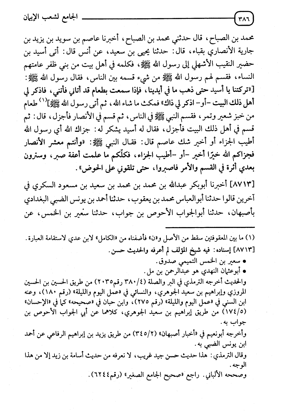 8713 - أَخْبَرَنَا أَبُو بَكْرٍ عَبْدُ اللهِ بْنُ مُحَمَّدِ بْنِ مُحَمَّدِ بْنِ سَعِيدِ بْنِ مَسْعُودٍ السُّكَّرِيُّ، فِي آخَرِينَ قَالُوا: نا أَبُو الْعَبَّاسِ مُحَمَّدُ بْنُ يَعْقُوبَ، نا أَحْمَدُ بْنُ يُونُسَ الضَّبِّيُّ الْبَغْدَادِيُّ، بأَصْبَهَانَ، نا أَبُو الْجَوَّابِ الْأَحْوَصُ بْنُ جَوَّابٍ، نا سُعَيْرُ بْنُ الْخُمُسِ، عَنْ -[387]- سُلَيْمَانَ التَّيْمِيِّ، عَنْ أَبِي عُثْمَانَ النَّهْدِيِّ، عَنْ أُسَامَةَ بْنِ زَيْدٍ، قَالَ: قَالَ رَسُولُ اللهِ صَلَّى اللَّهُ عَلَيْهِ وَسَلَّمَ: " مَنْ صُنِعَ إِلَيْهِ مَعْرُوفٌ " فَقَالَ لِصَاحِبِهِ: " §جَزَاكَ اللهُ خَيْرًا، فَقَدْ أَبْلَغَ فِي الثَّنَاءِ "
