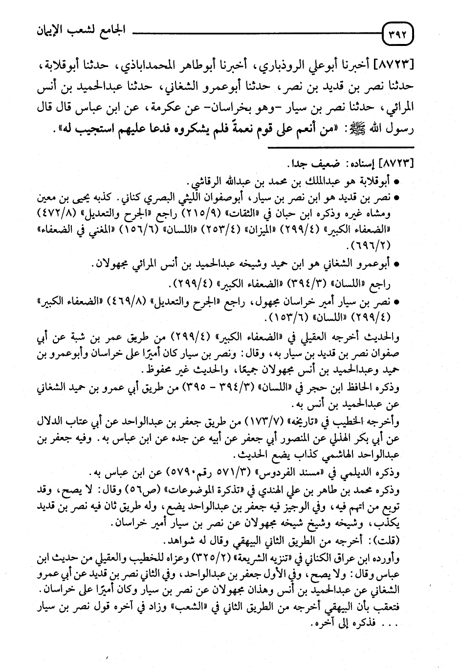 8723 - أَخْبَرَنَا أَبُو عَلِيٍّ الرُّوذْبَارِيُّ، أنا أَبُو طَاهِرٍ الْمُحَمَّدْ آبَادِيُّ، نا أَبُو قِلَابَةَ، نا نَصْرُ بْنُ قُدَيْدِ بْنِ نَصْرٍ، نا أَبُو عَمْرٍو الشِّغَافِيُّ، نا عَبْدُ الْحَمِيدِ بْنُ أَنَسٍ الْمُرَائِي، نا نَصْرُ بْنُ سَيَّارٍ وَهُوَ بِخُرَاسَانَ، عَنْ عِكْرِمَةَ، عَنِ ابْنِ عَبَّاسٍ، قَالَ: قَالَ رَسُولُ اللهِ صَلَّى اللَّهُ عَلَيْهِ وَسَلَّمَ: " §مَنْ أَنْعَمَ عَلَى قَوْمٍ نِعْمَةً فَلَمْ يَشْكُرُوهُ، فَدَعَا عَلَيْهِمُ اسْتُجِيبَ لَهُ " -[393]- قَالَ: وَقَالَ نَصْرُ بْنُ سَيَّارٍ: " اللهُمَّ إِنِّي قَدْ أَنْعَمْتُ عَلَى آلِ بَسَّامٍ فَلَمْ يَشْكُرُوا، اللهُمَّ فَأَذِقْهُمْ حَرَّ السِّلَاحِ، قَالَ: فَمَا مَاتَ مِنْهُمْ وَاحِدٌ إِلَّا بِالسَّيْفِ