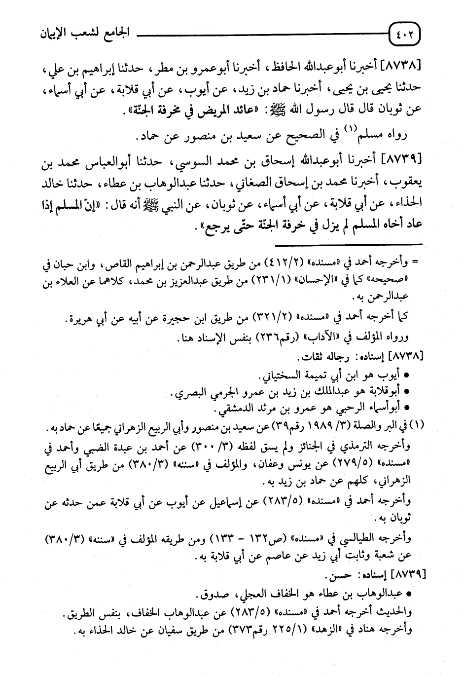 8738 - أَخْبَرَنَا أَبُو عَبْدِ اللهِ الْحَافِظُ، أَخْبَرَنِي أَبُو عَمْرِو بْنُ مَطَرٍ، نا إِبْرَاهِيمُ بْنُ عَلِيٍّ، نا يَحْيَى بْنُ يَحْيَى، أنا حَمَّادُ بْنُ زَيْدٍ، عَنْ أَيُّوبَ، عَنْ أَبِي قِلَابَةَ، عَنْ أَبِي أَسْمَاءَ، عَنْ ثَوْبَانَ، قَالَ: قَالَ رَسُولُ اللهِ صَلَّى اللَّهُ عَلَيْهِ وَسَلَّمَ: §" عَائِدُ الْمَرِيضِ فِي مَخْرَفَةِ الْجَنَّةِ ". رَوَاهُ مُسْلِمٌ فِي الصَّحِيحِ، عَنْ سَعِيدِ بْنِ مَنْصُورٍ، عَنْ حَمَّادٍ