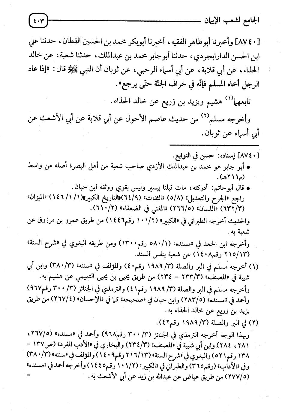 8740 - وَأَخْبَرَنَا أَبُو طَاهِرٍ الْفَقِيهُ، أنا أَبُو بَكْرٍ مُحَمَّدُ بْنُ الْحُسَيْنِ الْقَطَّانُ، نا عَلِيُّ بْنُ الْحَسَنِ الدَّارْابَجِرْدِيُّ، نا أَبُو جَابِرٍ مُحَمَّدُ بْنُ عَبْدِ الْمَلِكِ، نا شُعْبَةُ، عَنْ خَالِدٍ الْحَذَّاءِ، عَنْ أَبِي قِلَابَةَ، عَنْ أَبِي أَسْمَاءَ الرَّحْبِيِّ، عَنْ ثَوْبَانَ، أَنَّ النَّبِيَّ صَلَّى اللَّهُ عَلَيْهِ وَسَلَّمَ قَالَ: §" إِذَا عَادَ الرَّجُلُ أَخَاهُ الْمُسْلِمَ فَإِنَّهُ فِي خِرَافِ الْجَنَّةِ حَتَّى يَرْجِعَ ". تَابَعَهُمَا هُشَيْمٌ، وَيَزِيدُ بْنُ زُرَيْعٍ، عَنْ خَالِدٍ الْحَذَّاءِ. وَأَخْرَجَهُ مُسْلِمٌ، مِنْ حَدِيثِ عَاصِمٍ الْأَحْوَلِ، عَنْ أَبِي قِلَابَةَ، عَنْ أَبِي الْأَشْعَثِ، عَنْ أَبِي أَسْمَاءَ، عَنْ ثَوْبَانَ. " -[404]- وَالْمَعْنَى فِي هَذَا وَاللهُ أَعْلَمُ: أَنَّهُ يُثَابُ بِمَا يَهْتَمُّ بِهِ مِنْ أَمْرِ أَخِيهِ الْمُسْلِمِ أَنْ يَنْعَمَ غَدًا بِثِمَارِ الْجَنَّةِ، وَيَعْنِي بِالْخِرَافَةِ اجْتِثَاءَ ثَمَرِ الْجَنَّةِ، وَالْمَخْرَفَةُ: النَّخْلَةُ الَّتِي يُجْتَنَى مِنْهَا "