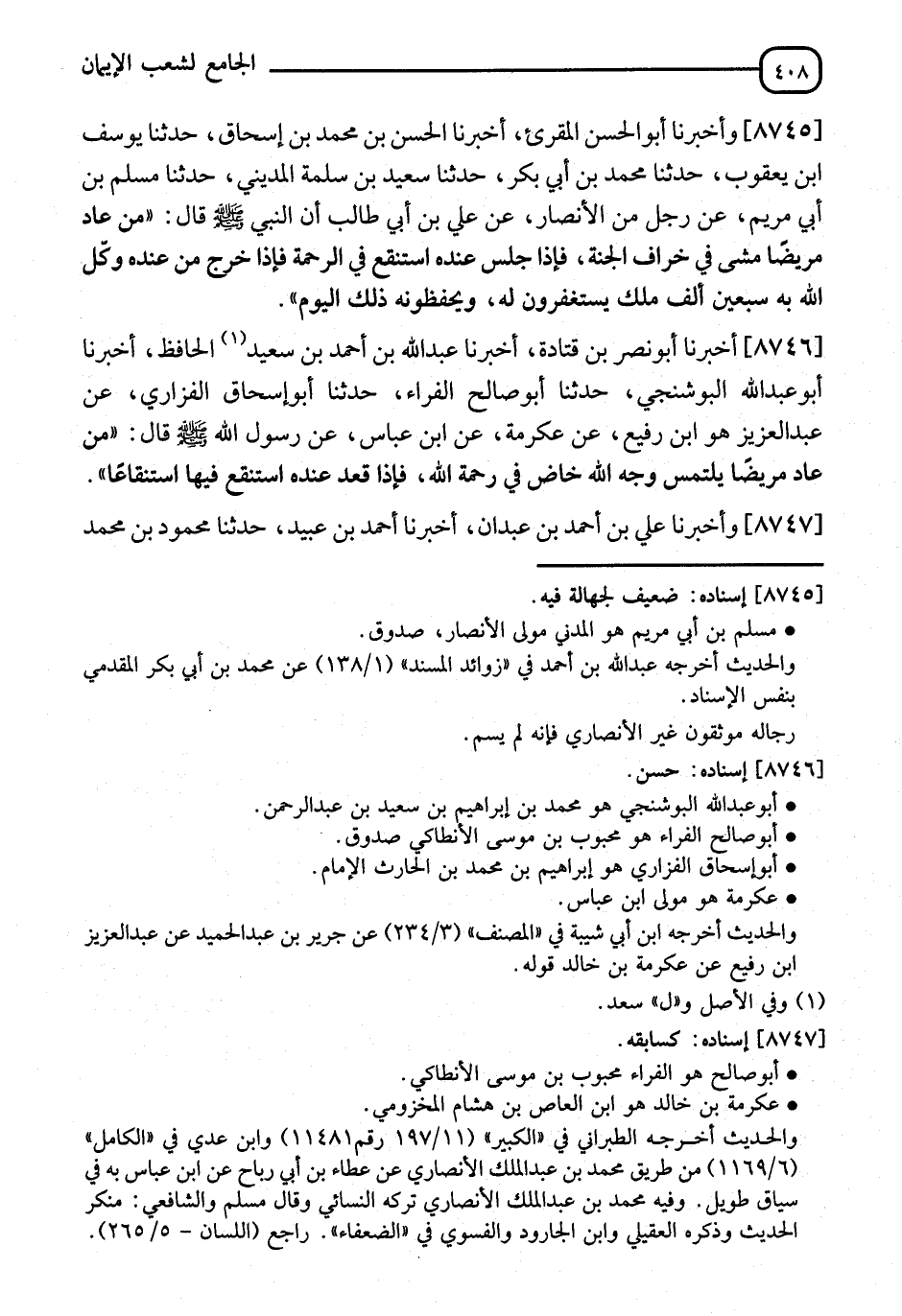 8746 - أَخْبَرَنَا أَبُو نَصْرِ بْنُ قَتَادَةَ، أنا عَبْدُ اللهِ بْنُ أَحْمَدَ بْنِ سَعْدٍ الْحَافِظُ، نا أَبُو عَبْدِ اللهِ الْبُوشَنْجِيُّ، نا أَبُو صَالِحٍ الْفَرَّاءُ، نا أَبُو إِسْحَاقَ الْفَزَارِيُّ، عَنْ عَبْدِ الْعَزِيزِ هُوَ ابْنُ رُفَيْعٍ، عَنْ عِكْرِمَةَ، عَنِ ابْنِ عَبَّاسٍ، عَنْ رَسُولِ اللهِ صَلَّى اللَّهُ عَلَيْهِ وَسَلَّمَ قَالَ: §" مَنْ عَادَ مَرِيضًا يَلْتَمِسُ وَجْهَ اللهِ خَاضَ فِي رَحْمَةِ اللهِ، فَإِذَا قَعَدَ عِنْدَهُ اسْتَنْقَعَ فِيهَا اسْتِنْقَاعًا ".