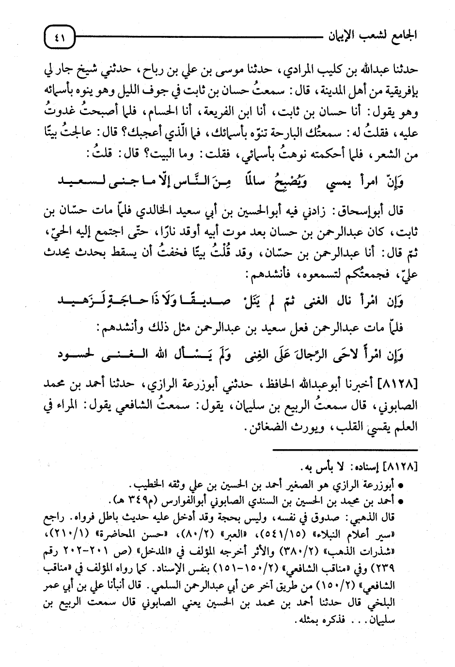 8128 - أَخْبَرَنَا أَبُو عَبْدِ اللهِ الْحَافِظُ، حَدَّثَنِي أَبُو زُرْعَةَ الرَّازِيُّ، نا أَحْمَدُ بْنُ مُحَمَّدٍ الصَّابُونِي، قَالَ: سَمِعْتُ الرَّبِيعَ بْنَ سُلَيْمَانَ، يَقُولُ: سَمِعْتُ الشَّافِعِيَّ، يَقُولُ: " §الْمِرَآءُ فِي الْعِلْمِ يُقَسِّي الْقَلْبَ، وَيُوَرِّثُ الضَّغَائِنَ "
