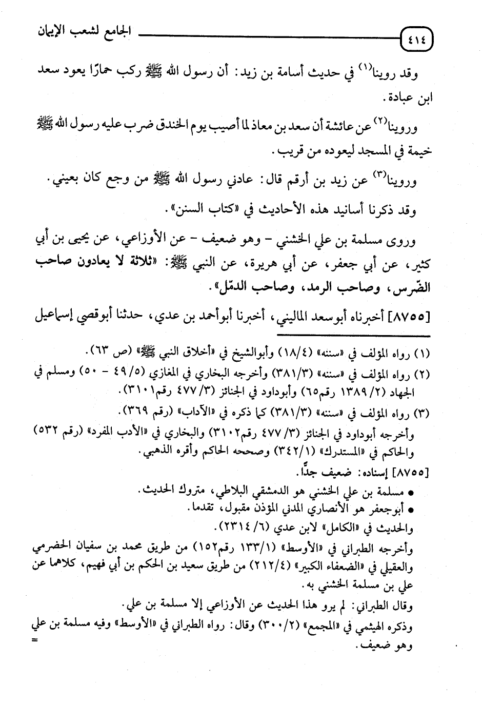 وَرُوِّينَا عَنْ زَيْدِ بْنِ أَرْقَمَ، قَالَ: §" عَادَنِي رَسُولُ اللهِ صَلَّى اللَّهُ عَلَيْهِ وَسَلَّمَ مِنْ وَجِعٍ كَانَ بِعَيْنَيَّ ". " وَقَدْ ذَكَرْنَا أَسَانِيدَ هَذِهِ الْأَحَادِيثِ فِي كِتَابِ السُّنَنِ "