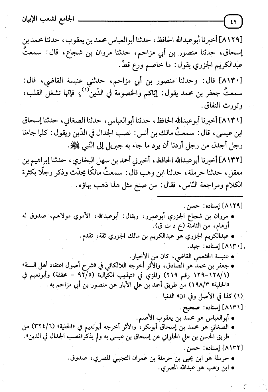 8131 - أَبُو عَبْدِ اللهِ، نا أَبُو الْعَبَّاسِ، نا الصَّغَانِيُّ، نا إِسْحَاقُ بْنُ عِيسَى، قَالَ: سَمِعْتُ مَالِكَ بْنَ أَنَسٍ، يَقُولُ: " §اجْتَنِبِ الْجِدَالَ فِي الدِّينِ، وَيَقُولُ: كُلَّ مَا جَاءَنَا رَجُلٌ أَجْدَلُ مِنْ رَجُلٍ أَرَدْنَا أَنْ نَرُدَّ مَا جَاءَ بِهِ جِبْرِيلُ إِلَى النَّبِيِّ صَلَّى اللَّهُ عَلَيْهِ وَسَلَّمَ "