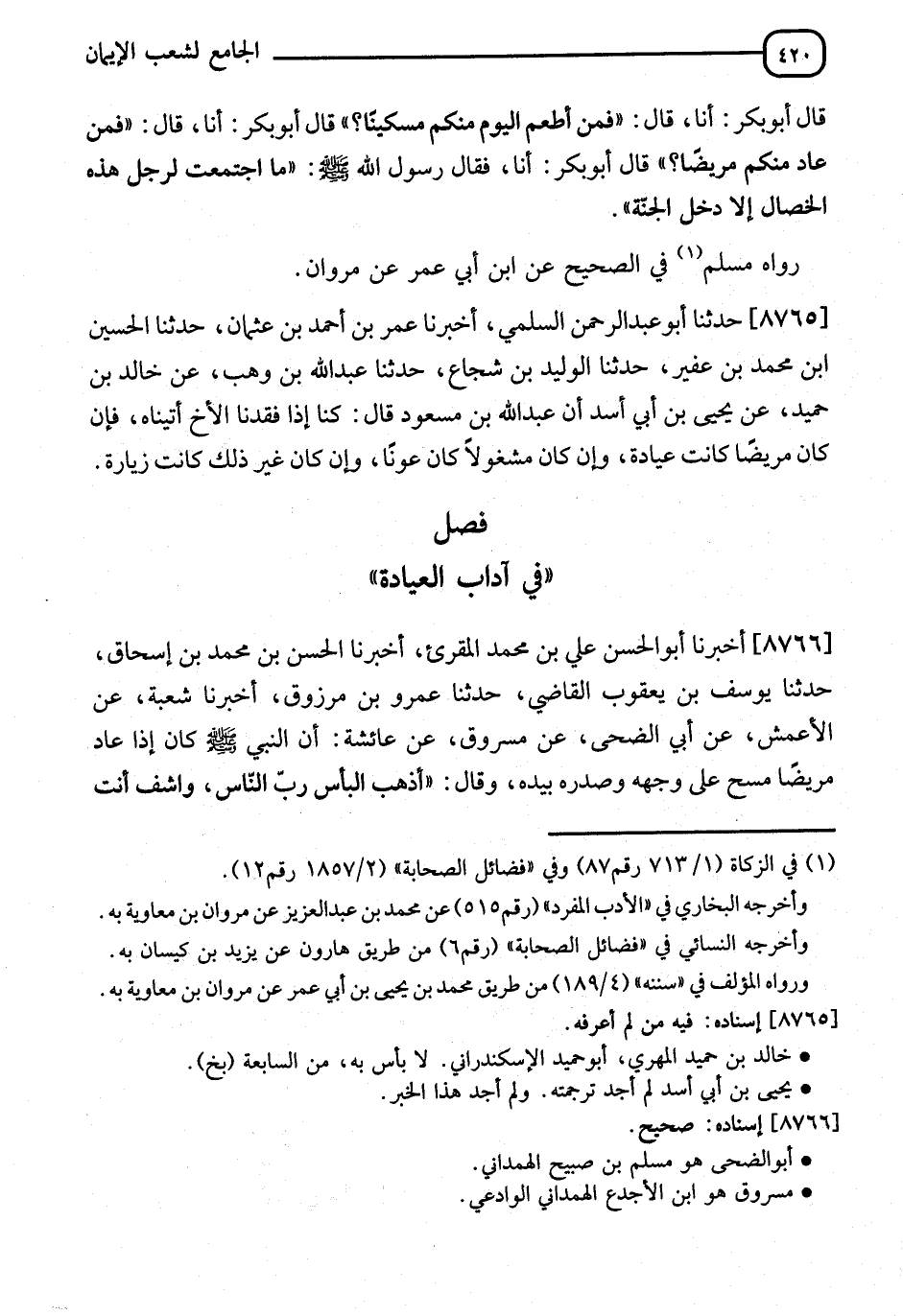8765 - حَدَّثَنَا أَبُو عَبْدِ الرَّحْمَنِ السُّلَمِيُّ، أنا عُمَرُ بْنُ أَحْمَدَ بْنِ عُثْمَانَ، نا الْحُسَيْنُ بْنُ مُحَمَّدِ بْنِ عُفَيْرٍ، نا الْوَلِيدُ بْنُ شُجَاعٍ، نا عَبْدُ اللهِ بْنُ وَهْبٍ، عَنْ خَالِدِ بْنِ حُمَيْدٍ، عَنْ يَحْيَى بْنِ أَبِي سَعْدٍ، أَنَّ عَبْدَ اللهِ بْنَ مَسْعُودٍ، قَالَ: " كُنَّا §إِذَا فَقَدْنَا الْأَخَ أَتَيْنَاهُ، فَإِنْ كَانَ مَرِيضًا كَانَتْ عِيَادَةً، وَإِنْ كَانَ مَشْغُولًا كَانَ عَوْنًا، وَإِنْ كَانَ غَيْرَ ذَلِكَ كَانَتْ زِيَارَةً "