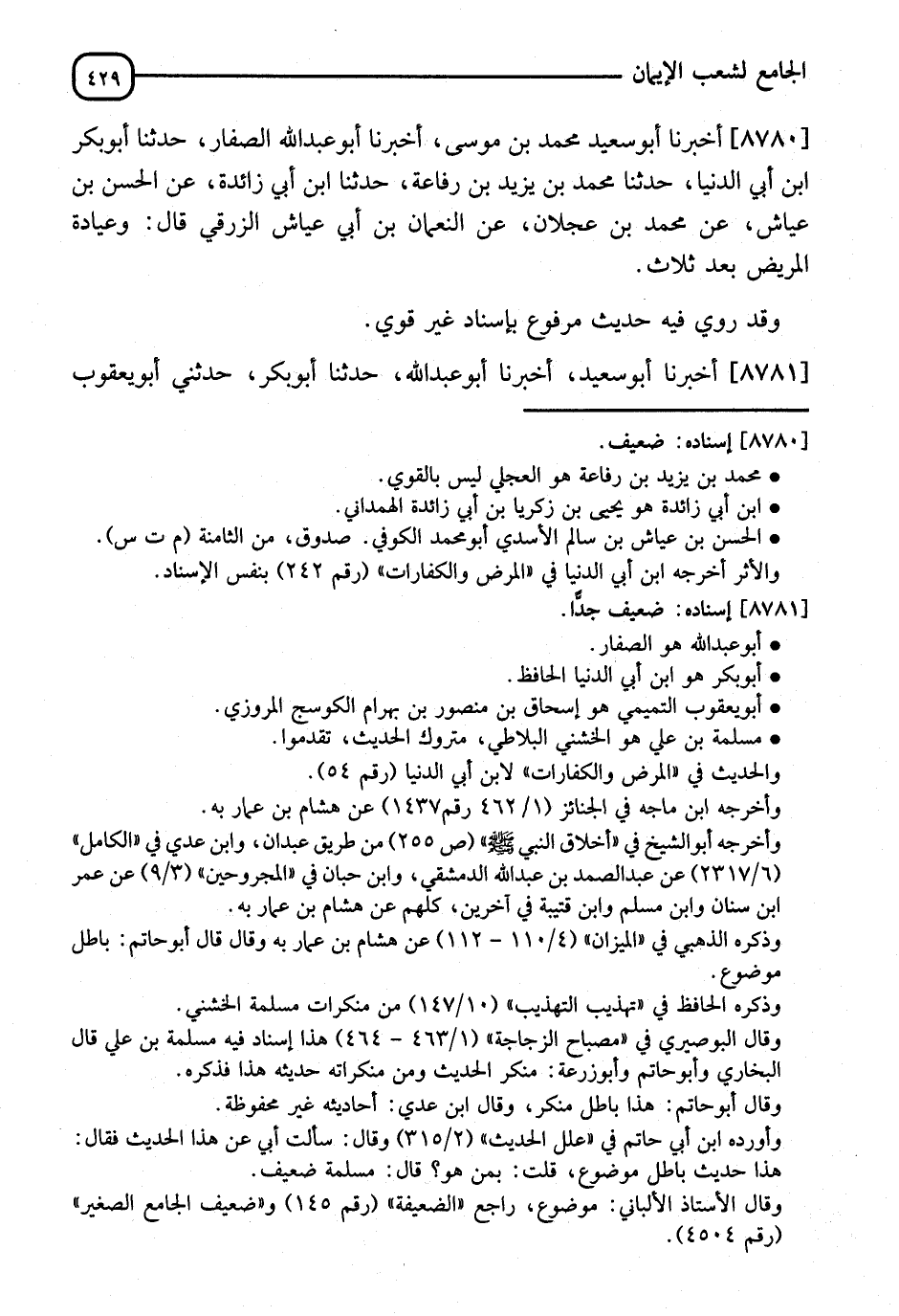 8780 - أَخْبَرَنَا أَبُو سَعِيدٍ مُحَمَّدُ بْنُ مُوسَى، أنا أَبُو عَبْدِ اللهِ الصَّفَّارُ، نا أَبُو بَكْرِ بْنُ أَبِي الدُّنْيَا، نا مُحَمَّدُ بْنُ زَيْدِ بْنِ رِفَاعَةَ، نا ابْنُ أَبِي زَائِدَةَ، عَنِ الْحَسَنِ بْنِ عَيَّاشٍ، عَنْ مُحَمَّدِ بْنِ عَجْلَانَ، عَنِ النُّعْمَانِ بْنِ أَبِي عَيَّاشٍ الزُّرَقِيِّ، قَالَ: §" وَعِيَادَةُ الْمَرِيضِ بَعْدَ ثَلَاثٍ ". " وَقَدْ رُوِيَ فِيهِ حَدِيثٌ مَرْفُوعٌ بِإِسْنَادٍ غَيْرِ قَوِيٍّ "