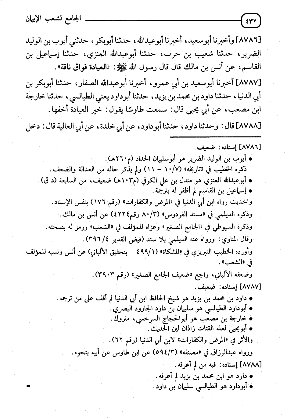 8787 - أَخْبَرَنَا أَبُو سَعِيدِ بْنُ أَبِي عَمْرٍو، أنا أَبُو عَبْدِ اللهِ الصَّفَّارُ، نا أَبُو بَكْرِ بْنُ أَبِي الدُّنْيَا، أنا دَاوُدُ بْنُ مُحَمَّدِ بْنِ يَزِيدَ، أنا أَبُو دَاوُدَ يَعْنِي الطَّيَالِسِيَّ، نا خَارِجَةُ بْنُ مُصْعَبٍ، عَنْ أَبِي يَحْيَى، قَالَ: سَمِعْتُ طَاوُسًا، يَقُولُ: §" خَيْرُ الْعِيَادَةِ أَخَفُّهَا "