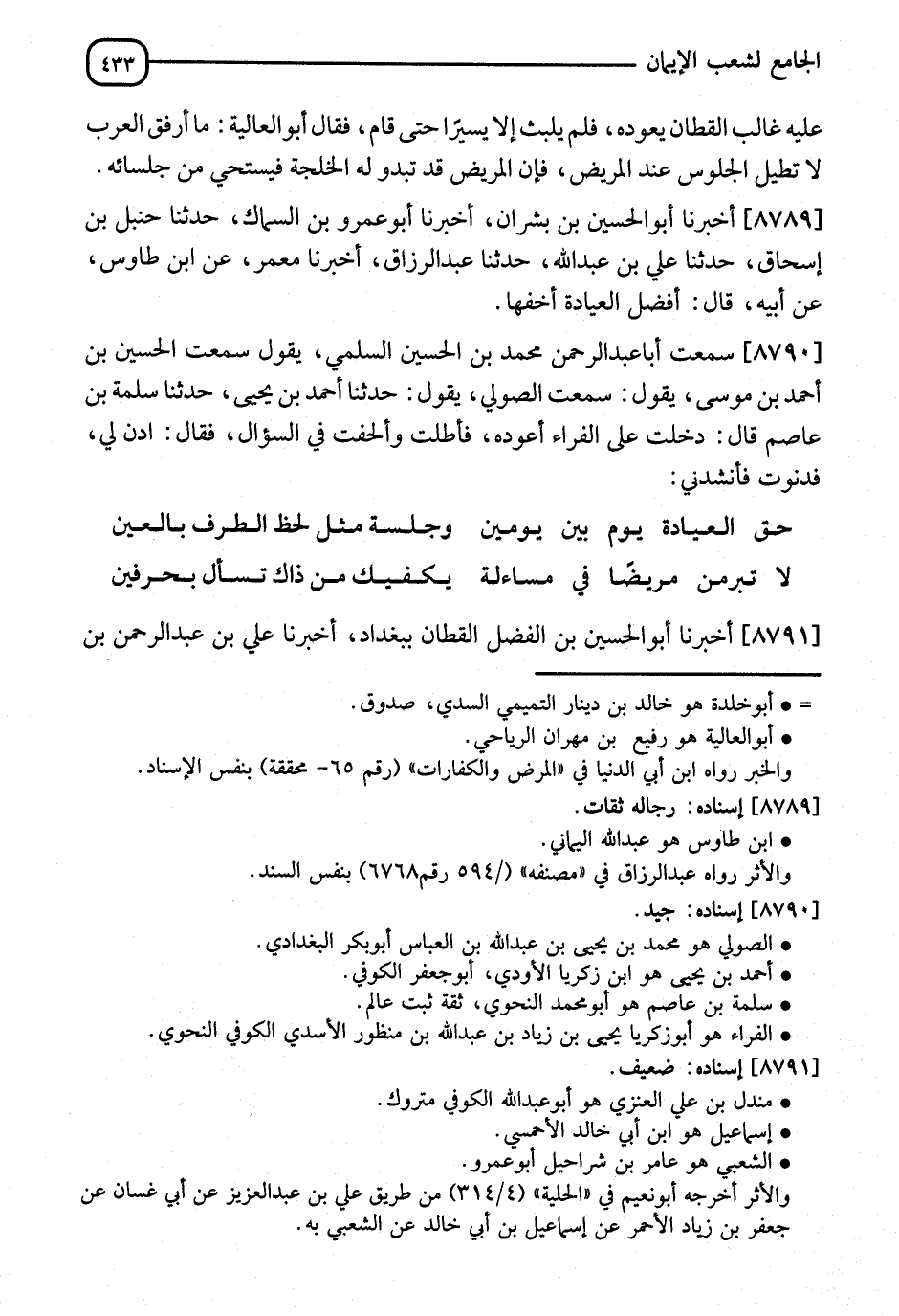 8791 - أَخْبَرَنَا أَبُو الْحُسَيْنِ بْنُ الْفَضْلِ الْقَطَّانُ، بِبَغْدَادَ، أنا عَلِيُّ بْنُ عَبْدِ الرَّحْمَنِ بْنِ -[434]- مَاتِي الْكُوفِيُّ، نا أَحْمَدُ بْنُ حَازِمِ بْنِ أَبِي غَرَزَةَ، أنا أَبُو غَسَّانَ مَالِكُ بْنُ إِسْمَاعِيلَ النَّهْدِيُّ، نا مِنْدَلُ بْنُ عَلِيٍّ الْغُبَرِيُّ، عَنْ إِسْمَاعِيلَ، عَنِ الشَّعْبِيِّ، قَالَ: " §عِيَادَةُ حَمْقَى الْقُرَّاءِ أَشَدُّ عَلَى أَهْلِ الْمَرِيضِ مِنْ مَرِيضِهِمْ، يَجِيئُونَ فِي غَيْرِ حِينٍ عِيَادَةً وَيَطْلُبُونَ الْجُلُوسَ "