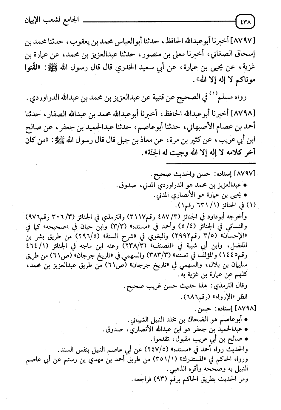 8797 - أَخْبَرَنَا أَبُو عَبْدِ اللهِ الْحَافِظُ، نا أَبُو الْعَبَّاسِ مُحَمَّدُ بْنُ يَعْقُوبَ، نا مُحَمَّدُ بْنُ إِسْحَاقَ الصَّنْعَانِيُّ، أنا مُعَلَّى بْنُ مَنْصُورٍ، نا عَبْدُ الْعَزِيزِ بْنُ مُحَمَّدٍ، عَنْ عُمَارَةَ بْنِ غَزِيَّةَ، عَنْ يَحْيَى بْنِ عُمَارَةَ، عَنْ أَبِي سَعِيدٍ الْخُدْرِيِّ، قَالَ: قَالَ رَسُولُ اللهِ صَلَّى اللَّهُ عَلَيْهِ وَسَلَّمَ: " §لَقِّنُوا مَوْتَاكُمْ: لَا إِلَهَ إِلَّا اللهُ ". رَوَاهُ مُسْلِمٌ فِي الصَّحِيحِ، عَنْ قُتَيْبَةَ، عَنْ عَبْدِ الْعَزِيزِ بْنِ مُحَمَّدِ بْنِ عُبَيْدِ اللهِ الدَّرَاوَرْدِيِّ