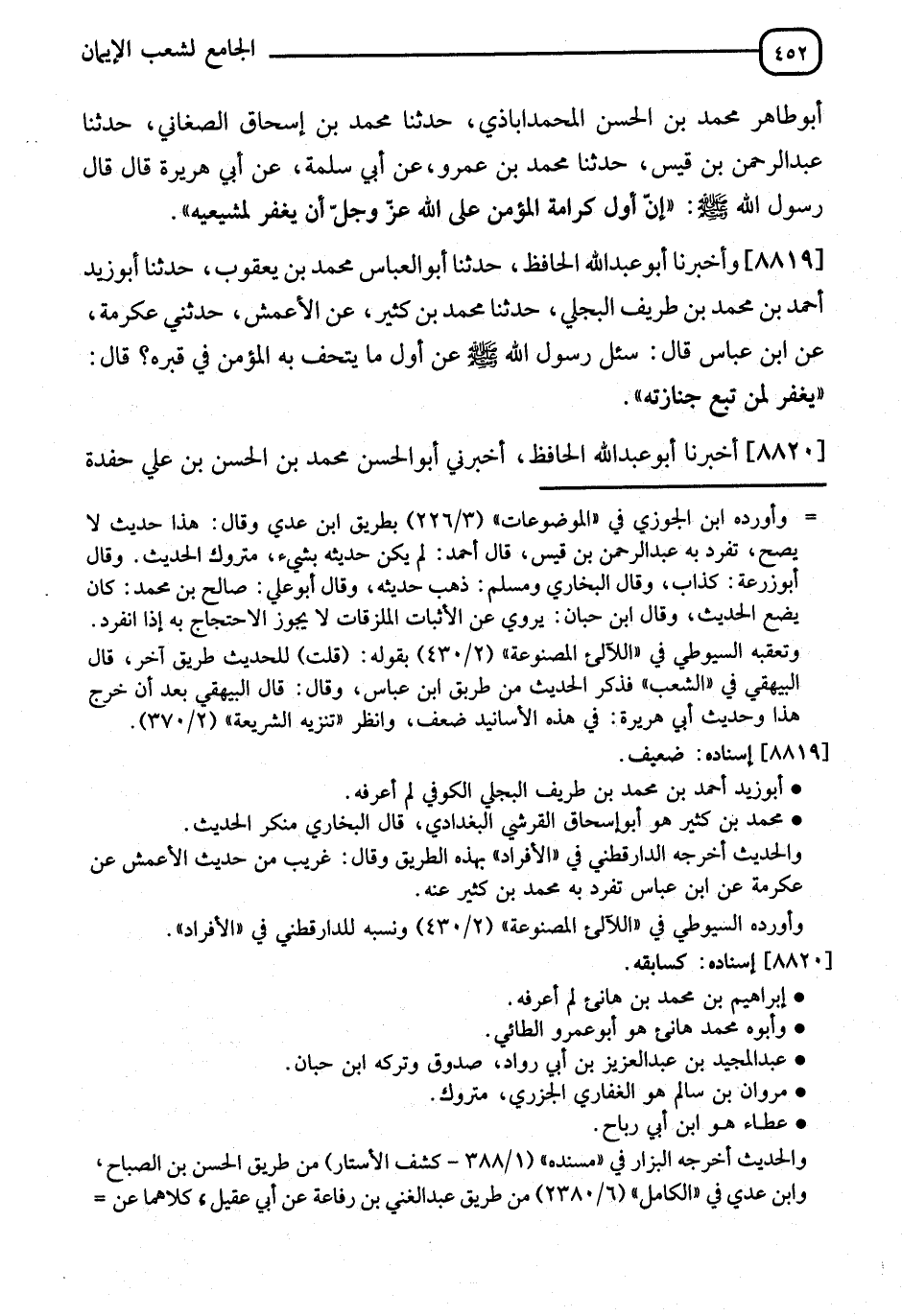 8820 - أَخْبَرَنَا أَبُو عَبْدِ اللهِ الْحَافِظُ، أَخْبَرَنِي أَبُو الْحَسَنِ مُحَمَّدُ بْنُ الْحَسَنِ بْنِ عَلِيٍّ حَفَدَةُ -[453]- إِبْرَاهِيمَ بْنِ هَانِئٍ، نا جَدِّي إِبْرَاهِيمُ بْنُ مُحَمَّدِ بْنِ هَانِئٍ، نا أَبِي مُحَمَّدُ بْنُ هَانِئٍ، أنا عَبْدُ الْمَجِيدِ بْنُ عَبْدِ الْعَزِيزِ بْنِ أَبِي رَوَّادٍ، عَنْ مَرْوَانَ بْنِ سَالِمٍ، عَنْ عَبْدِ الْمَلِكِ بْنِ أَبِي سُلَيْمَانَ، عَنْ عَطَاءٍ، عَنِ ابْنِ عَبَّاسٍ قَالَ: قَالَ رَسُولُ اللهِ صَلَّى اللَّهُ عَلَيْهِ وَسَلَّمَ: " إِنَّ §أَوَّلَ مَا يُجَازَى بِهِ الْعَبْدُ الْمُؤْمِنُ يَوْمَ الْقِيَامَةِ إِذَا مَاتَ أَنْ يُغْفَرَ لِجَمِيعِ مَنْ يَتْبَعُ جِنَازَتَهُ " فِي هَذِهِ الْأَسَانِيدِ ضَعْفٌ، وَاللهُ أَعْلَمُ، وَرُوِيَ ذَلِكَ عَنِ الزُّهْرِيِّ مِنْ قَوْلِهِ